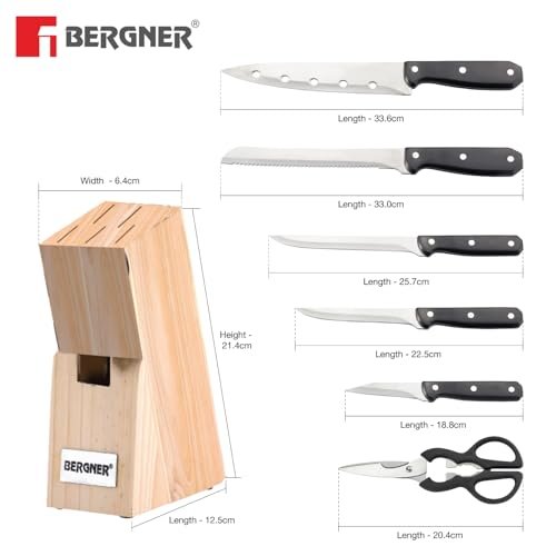 Ultimate Kitchen Arsenal : A comprehensive 8-piece set for all your culinary needs, including a chef’s knife, bread knife, boning knife, utility knife, paring knife, sharpener, scissors, and a wooden block Premium Stainless Steel Blades : Constructed from high-quality stainless steel, ensuring exceptional sharpness and durability for effortless cutting and slicing Ergonomic Handles : Designed for comfort and control,it provide a secure grip, reducing hand fatigue during extended use Anti-Skid Wooden Block : The sturdy wooden block keeps your knives organized and protected, with an anti-skid base to prevent accidents Versatile Cutting Solutions : From precise paring to robust chopping, this set offers a variety of knives to tackle any culinary task Easy to Clean and Maintain : The stainless steel blades and ABS handles are easy to clean, ensuring long-lasting performance Professional-Grade Sharpness : The included sharpener helps maintain optimal blade sharpness, ensuring clean and efficient cuts every time