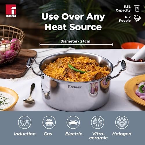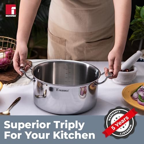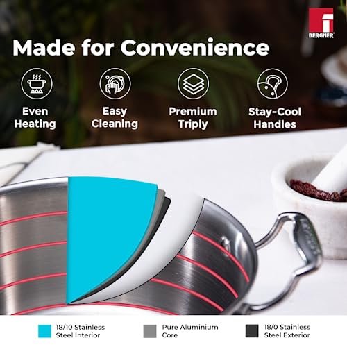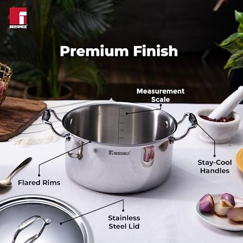 🍯Less Oil Use & Low Flame Cooking : The triply material heats evenly and reduces hot spots, preventing food from burning or sticking. This allows you to use less oil while still achieving a non-stick effect for healthier cooking ✔️TriPly Construction : TriPly stainless steel construction where the inner body is constructed using 18/10 stainless steel, the middle layer is of aluminum sheet, the outer layer is 18/0 stainless steel ♨️Faster Cooking : The construction helps to cook food 2 times faster than ordinary stainless steel cookware 🔢Measurement Scale : It comes with an inbuilt measurement scale, which helps you to follow the recipe effortlessly 🔘Compatibility : Compatible with induction, gas, halogen, electric, and vitro-ceramic 🆒Handle : Stay cool cast handle with riveted joints makes it easier to hold while cooking 🧼Effortless Cleaning : Multi-layer mirror finish for a sleek look that’s easy to clean 🍲Healthy Cooking : PFOA-free construction promotes healthy meals for you and your family