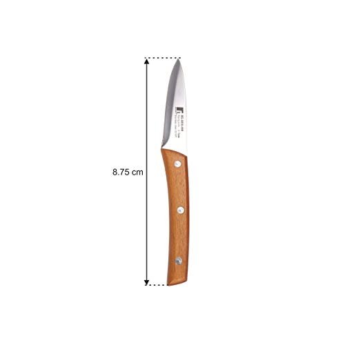 Composition: Stainless steel blade with wooden handle Durability: Stainless steel is an exceptionally durable material that is virtually impossible to wear out Sharp: Knife has long-lasting sharpness due to the hardened blades Stamped Construction: It’s stamped construction makes its light-weight which is best for daily cutting needs, heat treated for durability Wooden handle: Wooden handle ensures easy and a comfortable grip Applications: Used to peel garlic cloves, trilling mushrooms, paring green chilies and slicing small fruits Package: 1 Paring knife