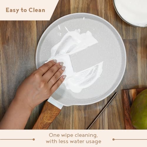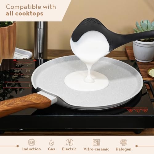 ✔️Jumbo-Sized Pancakes Made Easy : Craft giant, fluffy pancakes (30 cm diameter) with this impressive forged aluminum pan that ensures even heat distribution 👌🏻Effortless Non-Stick Advantage : The PFOA-free, multi-layer non-stick coating allows for minimal oil usage and effortless food release for perfect pancakes and easy cleaning ✨Elegant Marble-Inspired Finish : The stylish white granite coating adds a touch of sophistication to your kitchen decor 🔘Induction Compatible Versatility : Works flawlessly on all cooktops, including gas, electric, and induction 🤏🏻Comfortable Soft-Touch Handle : The ergonomically designed handle stays cool for comfortable maneuvering, even when flipping large pancakes