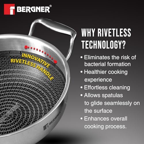 360 degree full induction turbo heat conductivity Stainless steel stay cool handle ergonomical design Extreme scratch resistance safe to use with metal utensils Honey comb pattern raised structure makes non stick stays intact for longer 3-ply structure spreads heat rapidly and evenly across the pan, food, especially those needs flash frying at high heat, cooks perfectly and stays juicy Stainless steel energy saving even heat distribution ss is an exceptionally durable material that is virtually impossible to wear, bonded with an aluminum capsuled bottom, it boasts satisfying heat conductivity 100 percent dishwasher safe