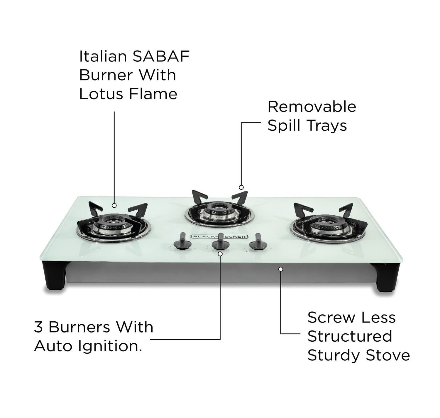 B+D 3 burner gas stove has 8 mm strong glass cooktop which is very easy to clean. This sleek design LPG stove toughened glass can handle up to 200kgs of load, without any complaint.