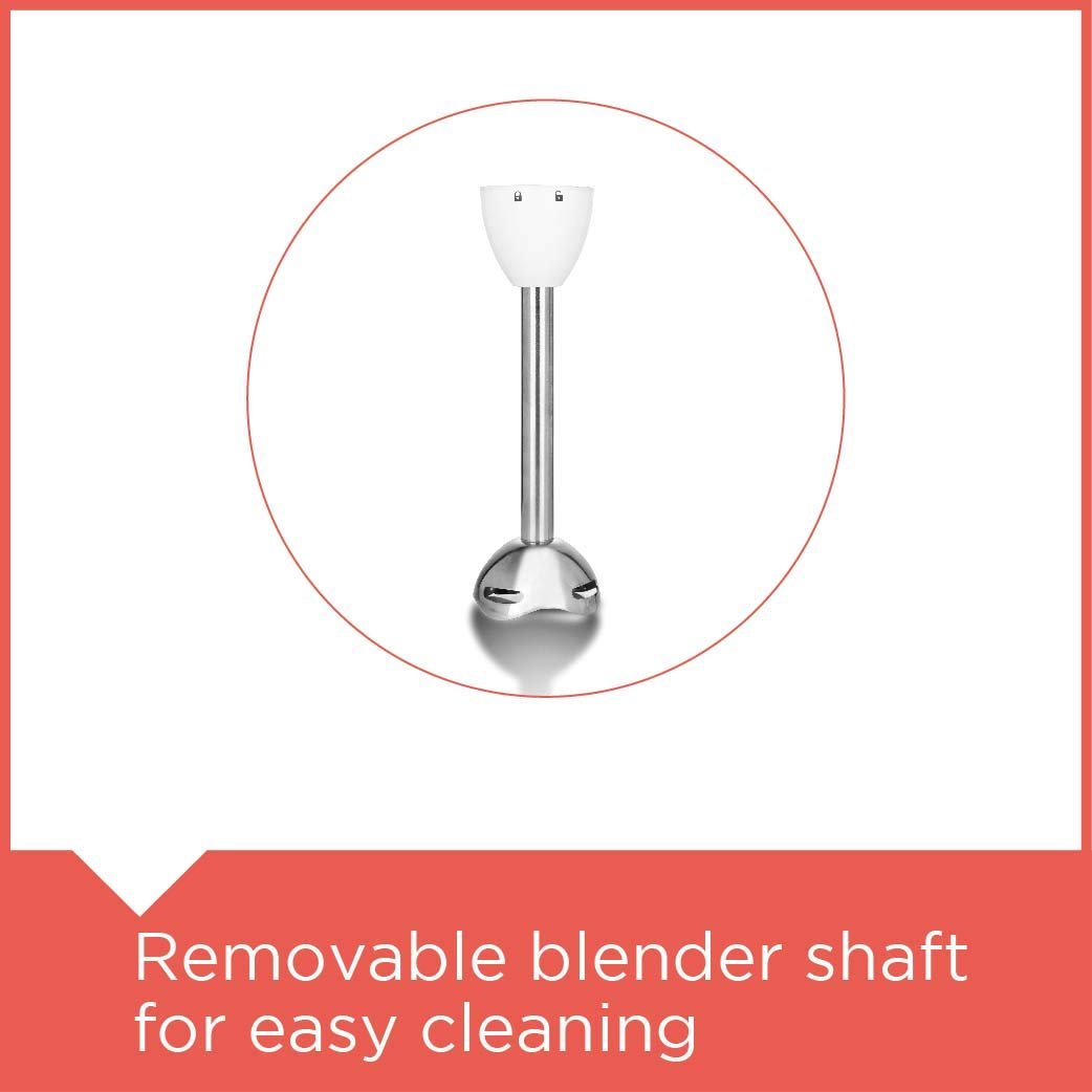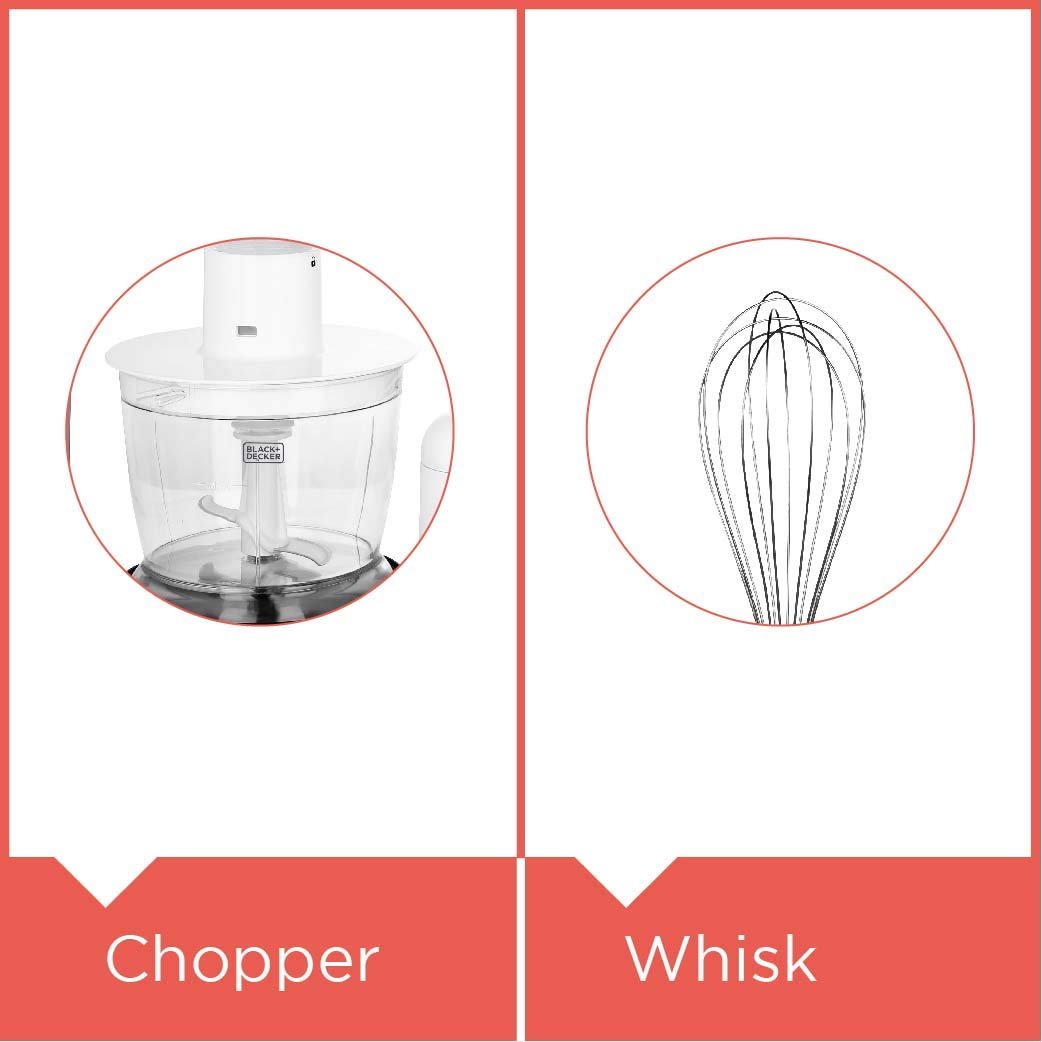 Multiple Attachments: Includes a blender, chopper, whisk, and measuring cup for versatile kitchen use.