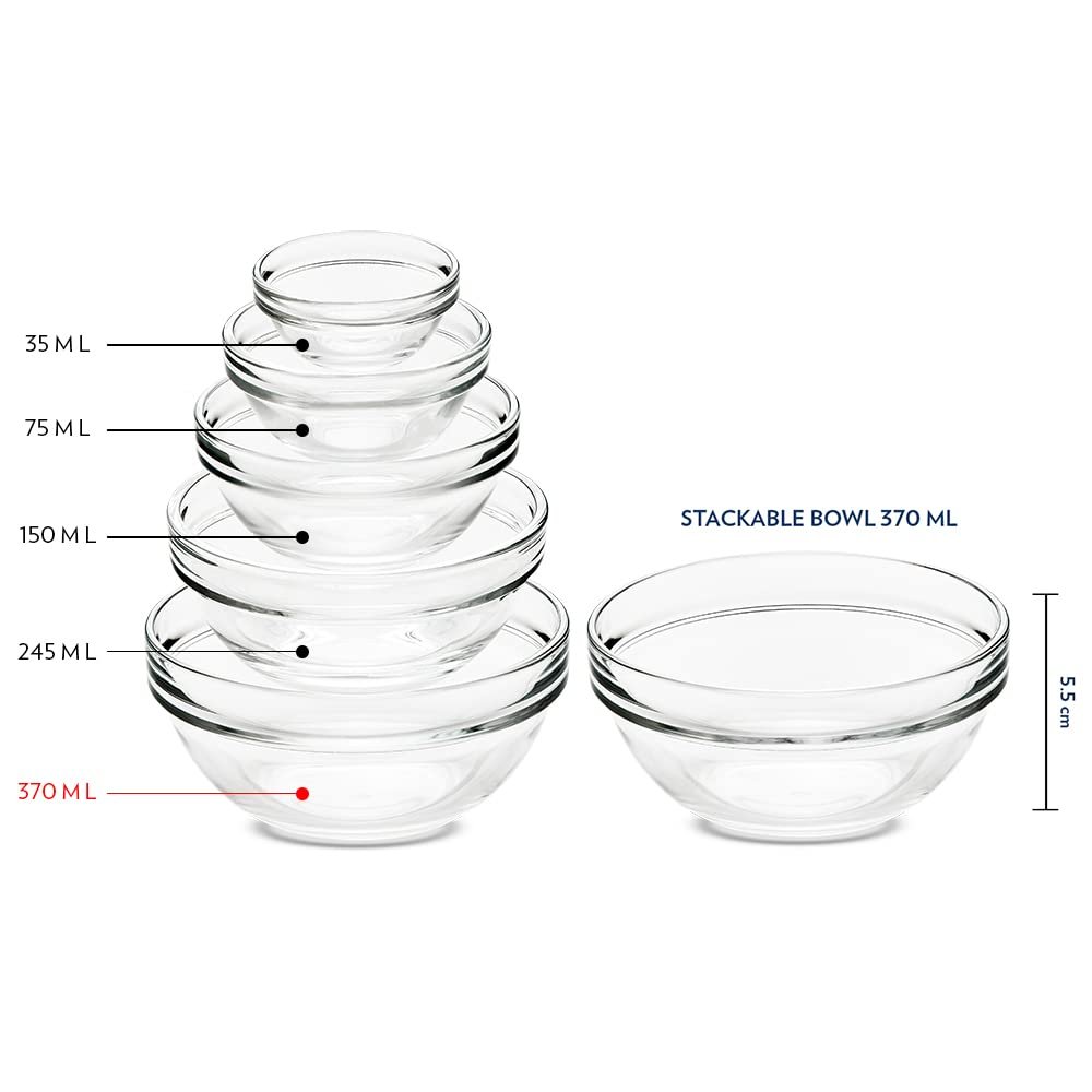Borosil Stackable Serving Bowl | Set of 6 (377 ml Each) | Borosilicate Glass Bowl for Kitchen & Dinning | Transparent Bowl for Dipping, Chutney, Herbs, Sauce, Ketchup | Microwave & Dishwasher Safe