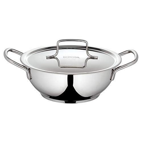 MADE OF HEAVY GAUGE STAINLESS STEEL – Whether you’re an amateur cook or a pro, you’ll appreciate the versatility this vessel brings to your kitchen. The Borosil stainless steel, deep bottom kadhai with lid can be used to fry puris, samosas or simmer dals, subzis and curries. The lid catches any oil spits so it’s great for large batch, long hours cooking activities. The heavy gauge stainless steel also makes the vessel durable and long-lasting TRI-PLY BASE FOR UNIFORM HEATING – Encapsulated tri-ply base heats quickly and allows heat to be evenly distributed providing a smooth and flawless cooking experience. SAFE FOR COOKING – Additionally, the tasla doesn’t discolor or affect any ingredient as the stainless steel cooking surface does not react with any food types. SAVES FUEL – Owing to the tri-ply base that heats quickly and distributes it evenly, cooking process becomes more energy efficient. This helps to save on fuel costs. COMPATIBLE WITH INDUCTION BASE- Crafted for enhanced cooking performance on conventional stove-tops including electric, gas and induction stoves. EASY TO CLEAN – The tri-ply kadhai is stick-resistant & dishwasher safe. IDEAL FOR FRYING & SIMMERING – This deep bottom kadhai is an ideal choice of cookware to cook puris and curries in. PACKAGE CONTENT – 1 kadhai, 1 lid WARRANTY – 5 Year warranty on Bottom, 1 year warranty on Product