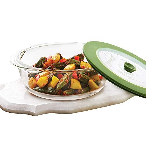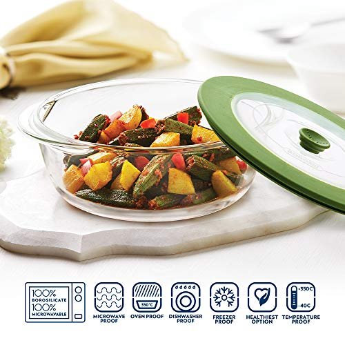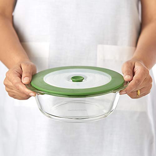 BOROSIL DISH-ROUND W/GREEN LID 1LTR