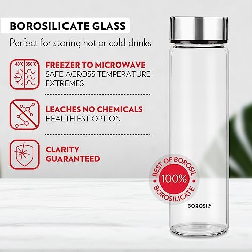Borosil Crysto Neo Glass Water Bottle 550ml, Wide Mouth, Silver SS Lid (Pack of 3) | 100% Borosilicate, Leak-Proof, Freezer Safe | Perfect for Hydration, Transparent, 500ml