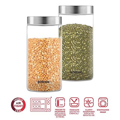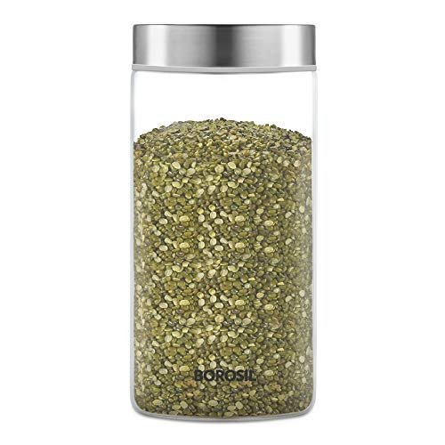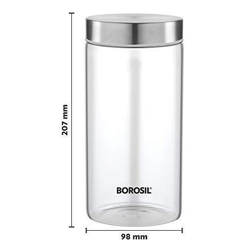 Borosil Easyscoop Endura 1.2 L Glass Jar With PP Lid & Scoop Cup, Air-Tight Storage Container For Kitchen, Glass Jar For Storing Spices, Dals, Grains, Rice, Clear With Grey Lid, Round