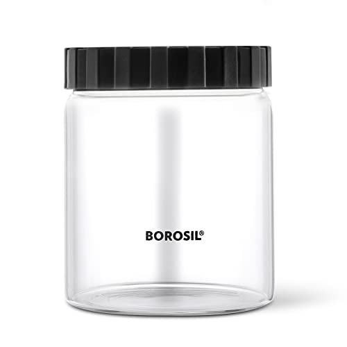 Borosil Easyscoop Endura 600 ml Glass Jar With PP Lid & Scoop Cup, Air-Tight Storage Container For Kitchen, Glass Jar For Storing Spices, Dals, Grains, Rice, Clear With Grey Lid, Round