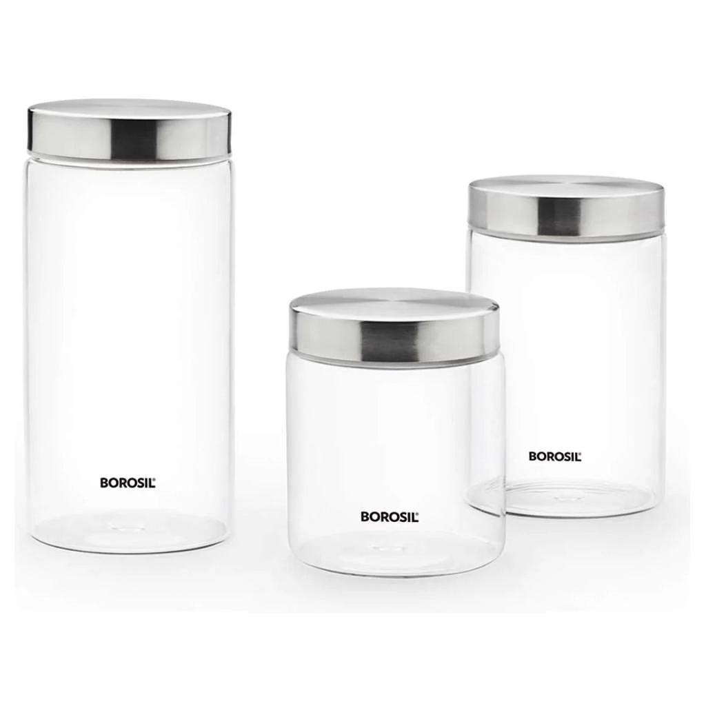 Borosil Endura Glass Jar, Air-Tight Storage Containers For Kitchen, Glass Storage Organiser For Spices, Snacks, Grains, Dals, Set of 3 (750ml+1L+1.3L), Clear