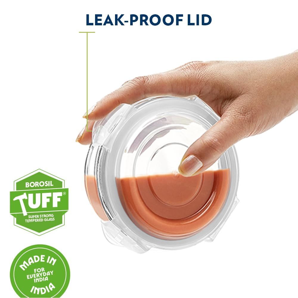 Borosil Klip n Store Lunchbox with Bag | Set of 3 (400 ml Each) | Borosilicate Glass, Round, Vertical | Microwave & Dishwasher Safe, Leak Proof | Tiffin for Office, School, College | Blue
