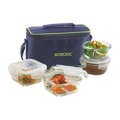 Borosil Prime Universal Lunchbox | 4pc Container Set (320ml x 2 Square + 240 ml x 2 Round) | Borosilicate Glass | Microwave & Dishwasher Safe | Tiffin for Office/School/College | Blue, Transparent