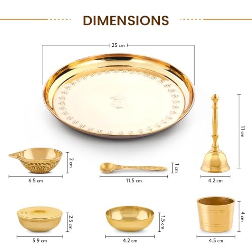 Borosil Brass Puja Thali Set | Aarti Thali for Mandir | Pooja Thali with Diya, Aggarbati Stand, Spoon, Glass, Bowl, and Bell | Decorative Puja Plate | Om Embossed Thali