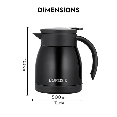 Material type: Stainless Steel; No. of pieces: 1; Capacity: 500 ml; Colour: Black Insulation type: Double wall; Temperature retention: Yes (Keeps liquid hot/cold upto 12 hrs hot n 14 hrs cold); Leak proof: Yes Best Usage: Office/Picnic/Home Warranty: 1 Year; Covered in warranty: This product is under one year warranty from the date of retail purchase against any manufacturing defects in material and workmanship. Warranty valid against producing original bill endorsed by the seller.1 year warranty on manufacturing defect; Not covered in warranty: The warranty does not cover damages resulting from accidents, mishandling or tampering with mechanism. Inner wall: SS 304 Grade; Outer wall: SS 201 Grade Double walled vacuum insulated with copper coating for better temperature retention 12 hrs hot n 14 hrs cold Pour spout opens easily with push button ease, making one handed pouring simple