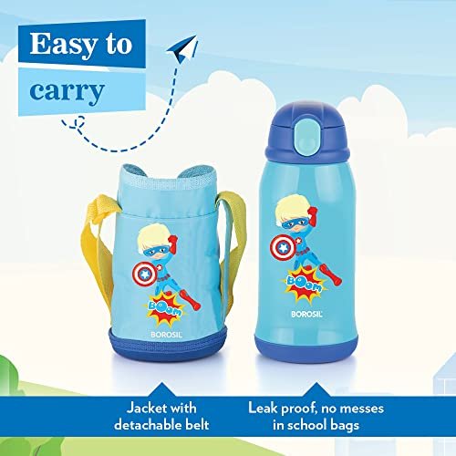 Borosil Superhero 500 ml Stainless Steel Kids Sipper Water Bottle | Double Wall Vacuum Insulated Flask | 12 Hours Hot & Cold | Leakproof, BPA Free | 1 Year Warranty, Blue
