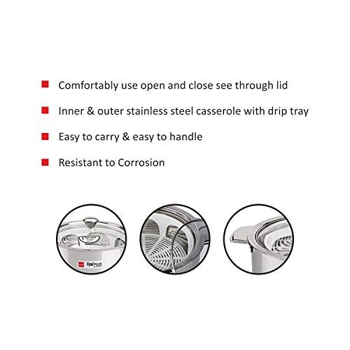Stainless Steel Double Walled: The casserole features a premium stainless steel double-walled construction that provides superior insulation. This design ensures optimal temperature retention, keeping your dishes hot or cold for longer periods and maintaining their perfect serving temperature. Easy Grip Handle: Designed with ergonomics in mind, the casserole includes an easy grip handle that offers a comfortable and secure hold. Whether you’re carrying it to the table or serving from it, the handle provides excellent control and convenience. Serving Bowl with Lid: This stylish serving bowl comes with a matching lid, perfect for both serving and storing. The lid locks in freshness and flavor while adding a touch of sophistication to your dining presentation. Casserole with Drip Tray: Equipped with a built-in drip tray, the casserole captures excess moisture and prevents unwanted drips. This feature ensures that your dishes remain crisp and delicious, enhancing your overall dining experience by maintaining the quality of your food. Elegant and Functional Design: Combining sleek lines with modern functionality, the Cello casserole is designed to be both elegant and practical. Its sophisticated appearance enhances any table setting, while its functional features make it an essential kitchen tool.