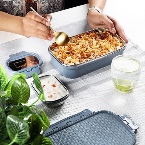 Superior Insulation: This steel lunch box is designed with insulation to keep your meals at the desired temperature, ensuring freshness throughout the day. Convenient Inner Veg Box: Includes a separate veg box for packing healthy snacks or side dishes alongside your main meal, providing versatility in your lunch options. Eye-catching Matrix Pattern: The lunch box showcases a sleek matrix pattern, adding a touch of modernity and style to your lunchtime routine. Durable and Practical: Made from high-quality steel, this lunch box is sturdy, easy to clean, and designed for everyday use, making it an ideal choice for school or work. Secure and Leak-Proof: Equipped with a reliable 4-sided click lock closure, this lunch box keeps your food secure, preventing leaks and spills during transport.