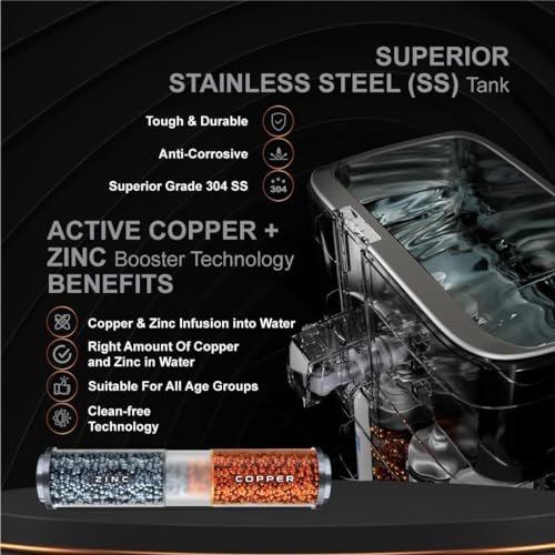 Product Technology- RO+UV+TA with patented Active Copper Technology Patented Active Copper Technology- Adds the goodness of copper through infusion of the right amount of active copper ions into purified water Stainless Steel Tank- Equipped with a storage tank made of high grade 304 stainless steel that is corrosion-free, tough and durable Purification Process- RO Membrane removes contaminants like lead and mercury and eliminates disease-causing viruses and bacteria. UV e-boiling delivers water that is as safe and pure as water boiled for over 20 minutes Taste Adjuster (MTDS)- Provides sweet tasting water by adjustment of taste depending upon the source of water Water Suitability- This product is suitable for water from all sources (tanker/ borewell/ municipal water) and can be used for TDS up to 2000 PPM Inbuilt Tray to place your bottle/ glass while dispensing water