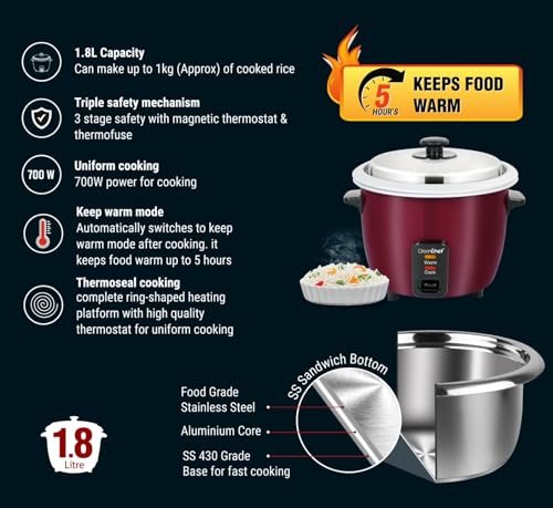 With an aluminium pan, measuring cup, rice scoop and a stainless-steel lid, this rice cooker comes equipped with food-grade accessories ensuring safe cooking standards. Indicators for warm and cook modes and water level make this rice cooker easy to use.