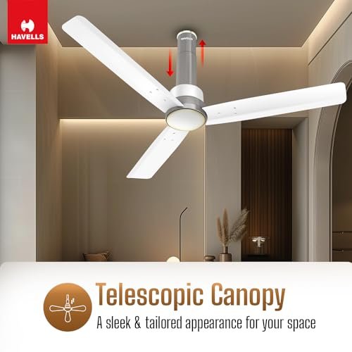 Energy-Efficient BLDC Motor (100% Copper Winding): Powered by a 5-star rated BLDC motor with 100% copper winding, this fan ensures up to 60% energy savings compared to conventional fans, offering excellent performance and reduced electricity costs. Telescopic Canopy for Flexible Installation: The telescopic canopy design allows easy installation and adjustment for different ceiling heights, ensuring a sleek, adaptable look in any room. Aerodynamic Metallic Finish Blades: Crafted with aerodynamically designed blades featuring an elegant metallic finish, it delivers a high air delivery rate of 225 m³/min, combining functionality with aesthetic appeal. Sleek and Minimalist Design: The modern, minimalist design with premium finishes enhances the aesthetics of your interiors, blending functionality with a touch of elegance. Customise your Comfort with Multiple Modes: Offers four modes—Breeze, Sleep, Boost, and MOP—enabling you to customize airflow to suit your comfort needs, whether it’s for relaxation, sleep, or intense cooling. Advanced RF Remote Control: The Radio Frequency remote enables effortless operation of speed and timer settings from any direction, eliminating the need for a regulator and ensuring seamless, hassle-free control. Silent Operation for Peaceful Spaces: The advanced motor and aerodynamic blade design minimize noise, ensuring quiet operation upto 65 dB, making it ideal for bedrooms, offices, and other peaceful environments. Extended Warranty (upto 5 years) and Registration Benefits: Offers a 2-year comprehensive warranty with an additional 1-year extended warranty when registered on the Havells website, ensuring long-term reliability.