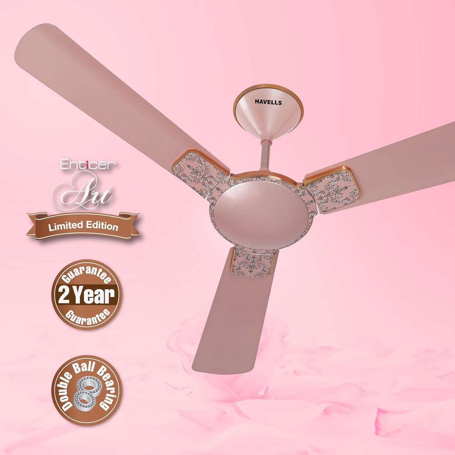 The Havells Enticer Art ES : Collector & Heritage Edition Rose Gold 1200 mm Ceiling Fan, FHCEA2SROG48 is a ubiquitous and indispensable household appliance that plays a crucial role in enhancing indoor comfort and ventilation. Mounted on the ceiling, these fans have a horizontal rotation that circulates air within a room, creating a cooling effect by promoting air movement.