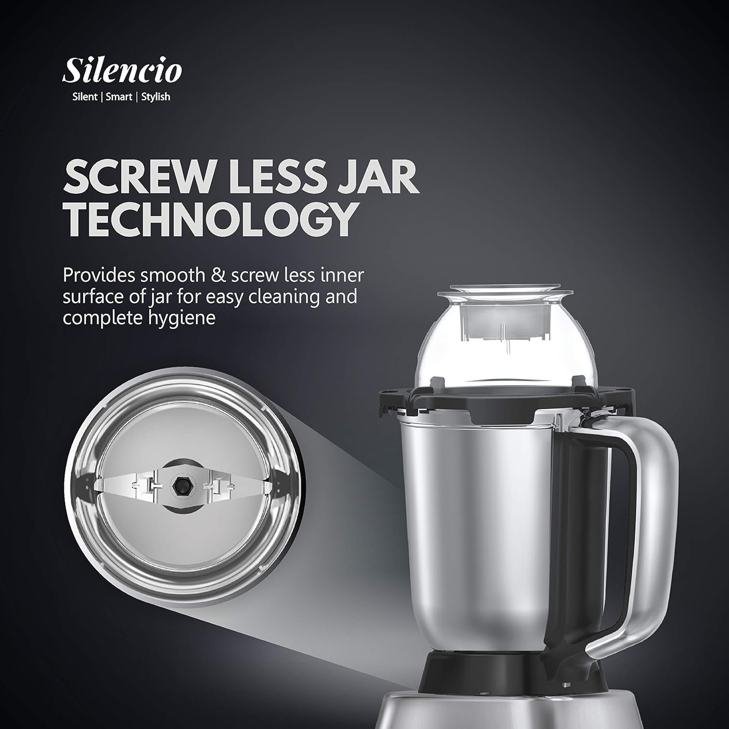 screw less jar technology -new handle fixing technology provides smooth & screw less inner surface of jar for easy cleaning and complete hygiene
