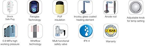 Feroglass coated tank with single weld-line design Incoloy heating element Energy Saving High Density PUF Insulations, CFC free high density PUF insulation prevents heat loss Capacity: 25 liters. The rated pressure is 0.8 MPa Warranty: 7 years on inner container, 4 years on heating element and 2 years comprehensive Power: 3000 watts; Operating Voltage: 220 – 240 volts Includes: Heater, Manual, Wall mounting accessory and 2 flexi pipe Country of Origin: India