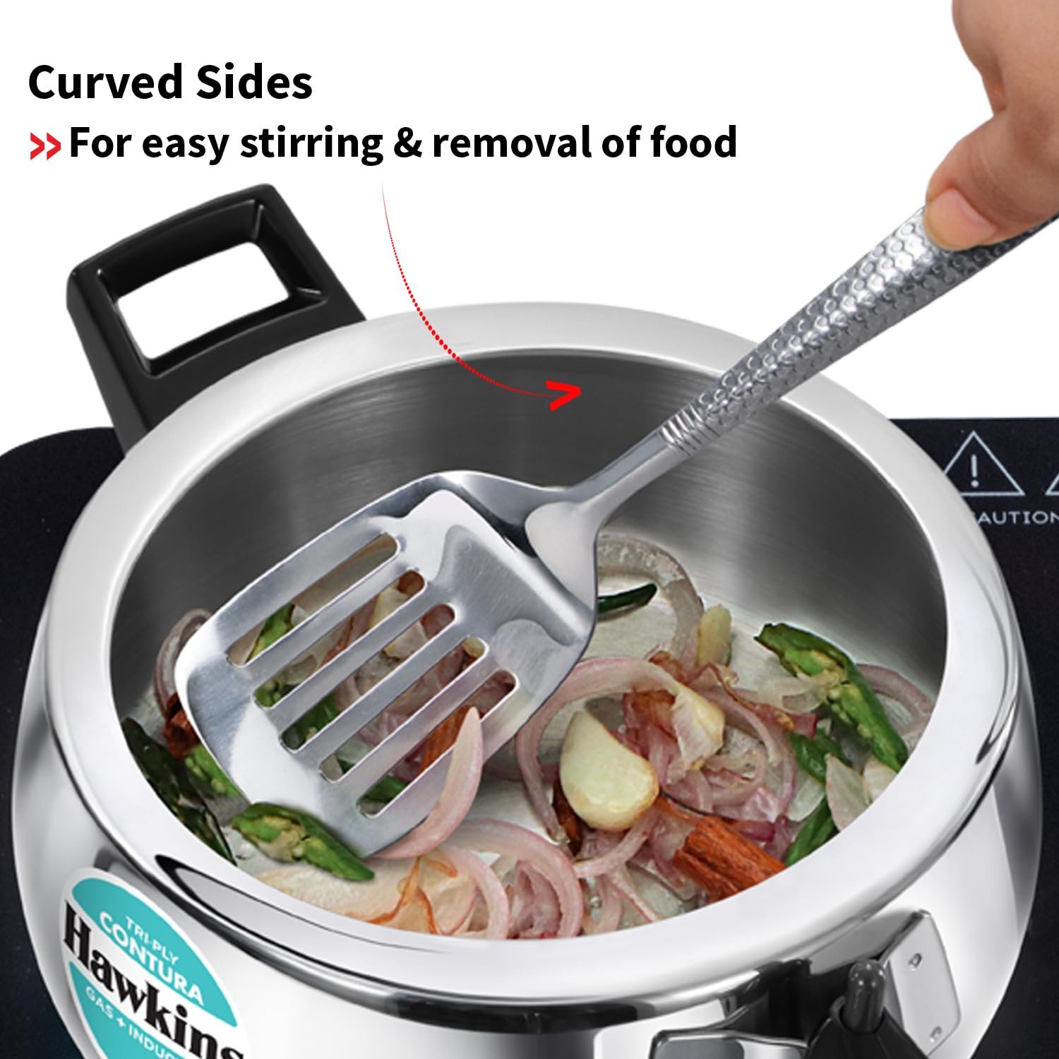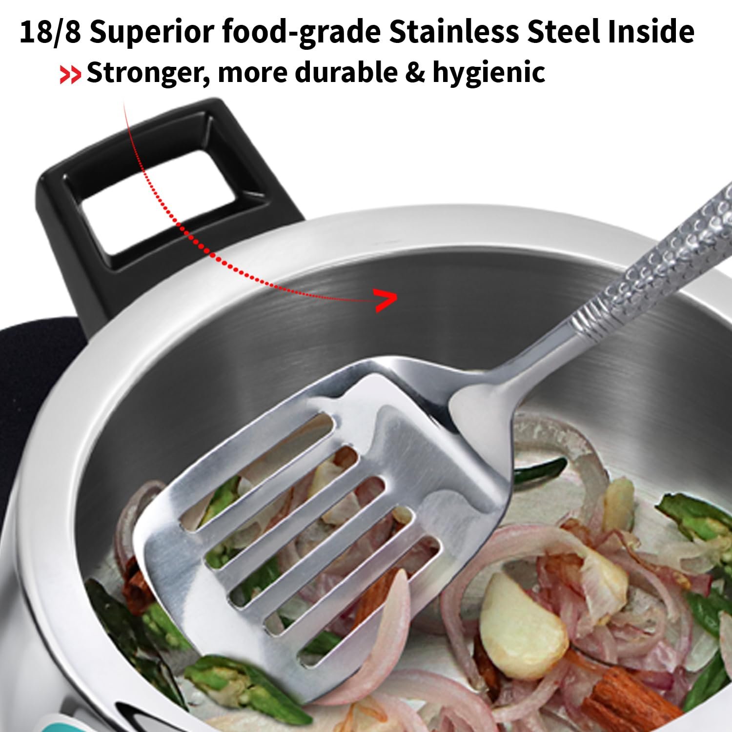 • Uniformly heats base and sides – Food and spices do not burn & stick. Needs less oil