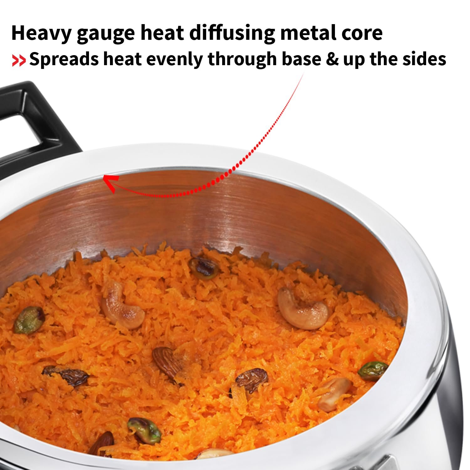 • Heavy gauge heat diffusing metal core – Spreads heat evenly through base & up the sides for quick, even cooking