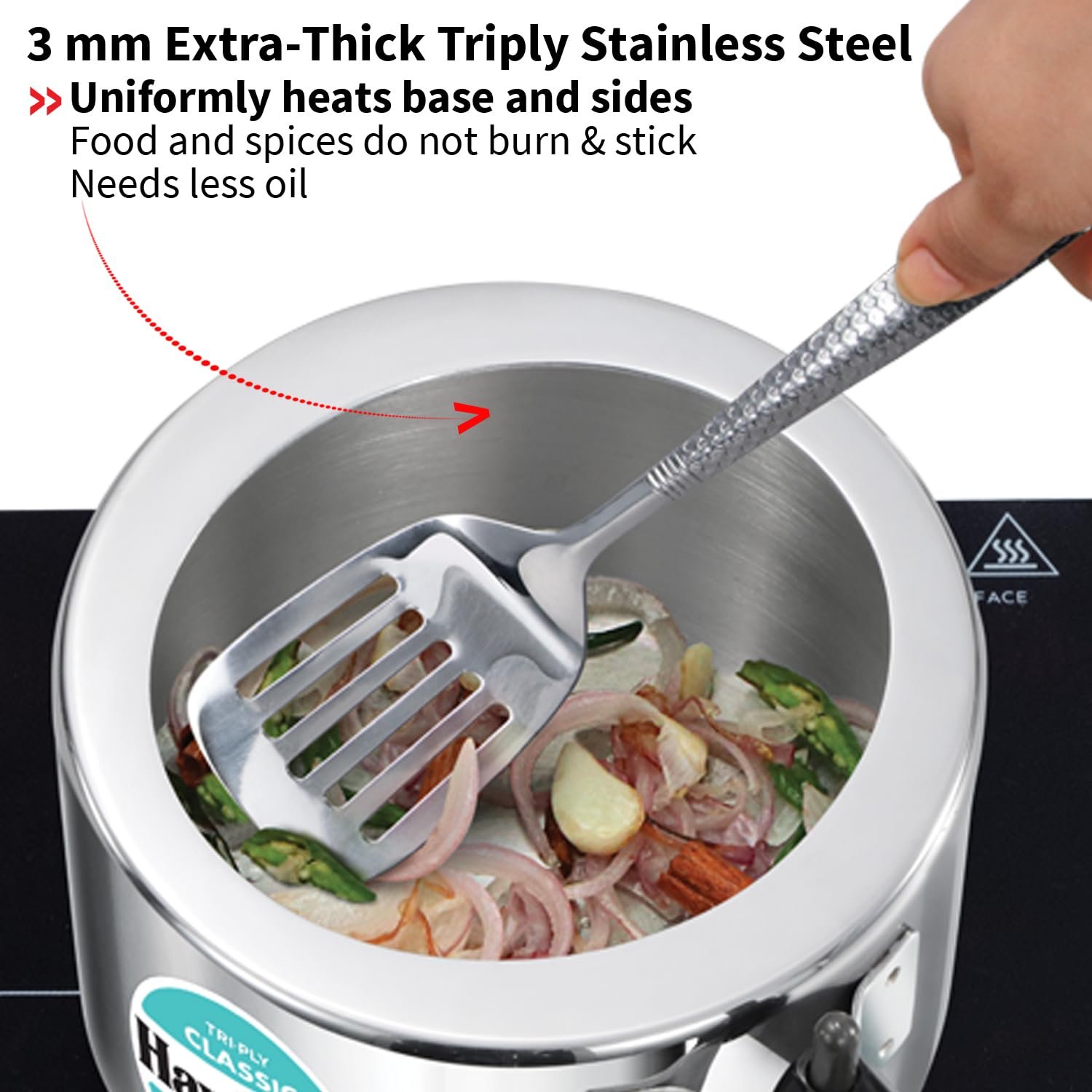 • Uniformly heats base and sides – Food and spices do not burn & stick. Needs less oil