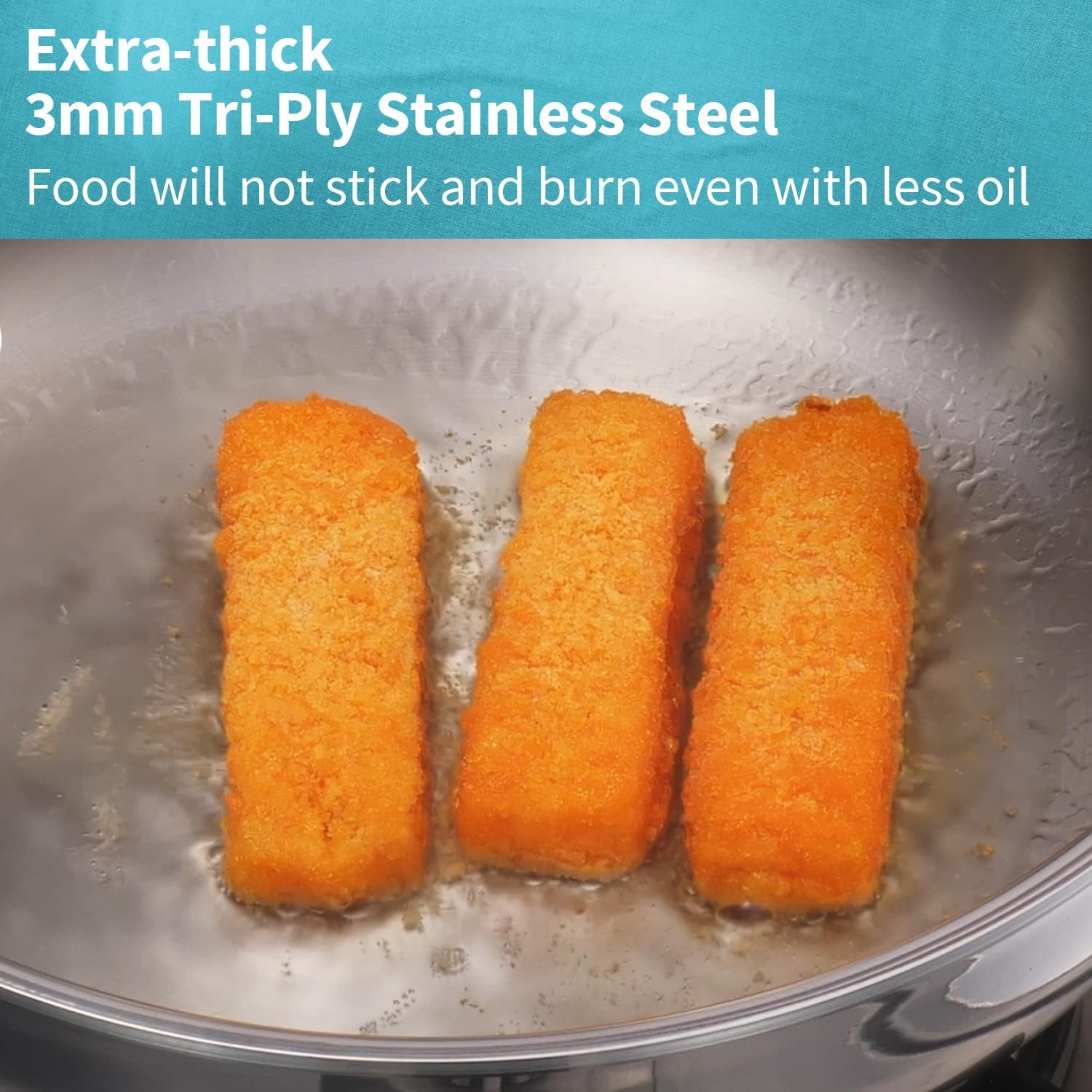 • Extra-thick 3mm Tri-Ply Stainless Steel – Food will not stick and burn even with less oil