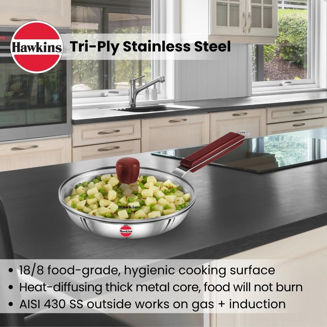 • Hawkins Tri-Ply Stainless Steel Cookware retains the advantages of cooking on stainless steel surfaces while eliminating the disadvantages of sticking and burning that come with normal stainless steel