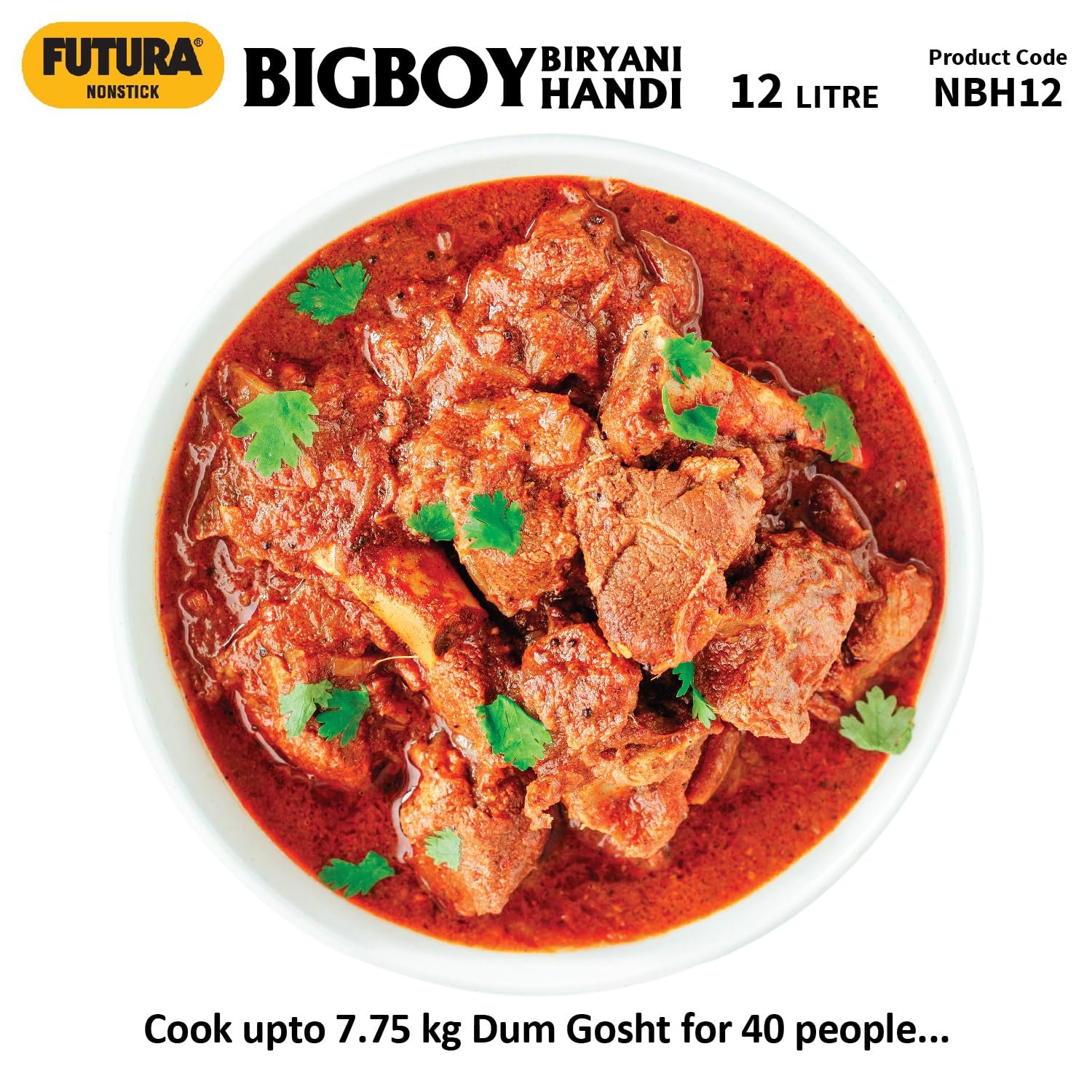 • Unique Lid for Dum Biryani – holds water, makes lid cooler. Steam condenses under lid, falls back into food. Cooks with less water. Makes more flavourful Biryani