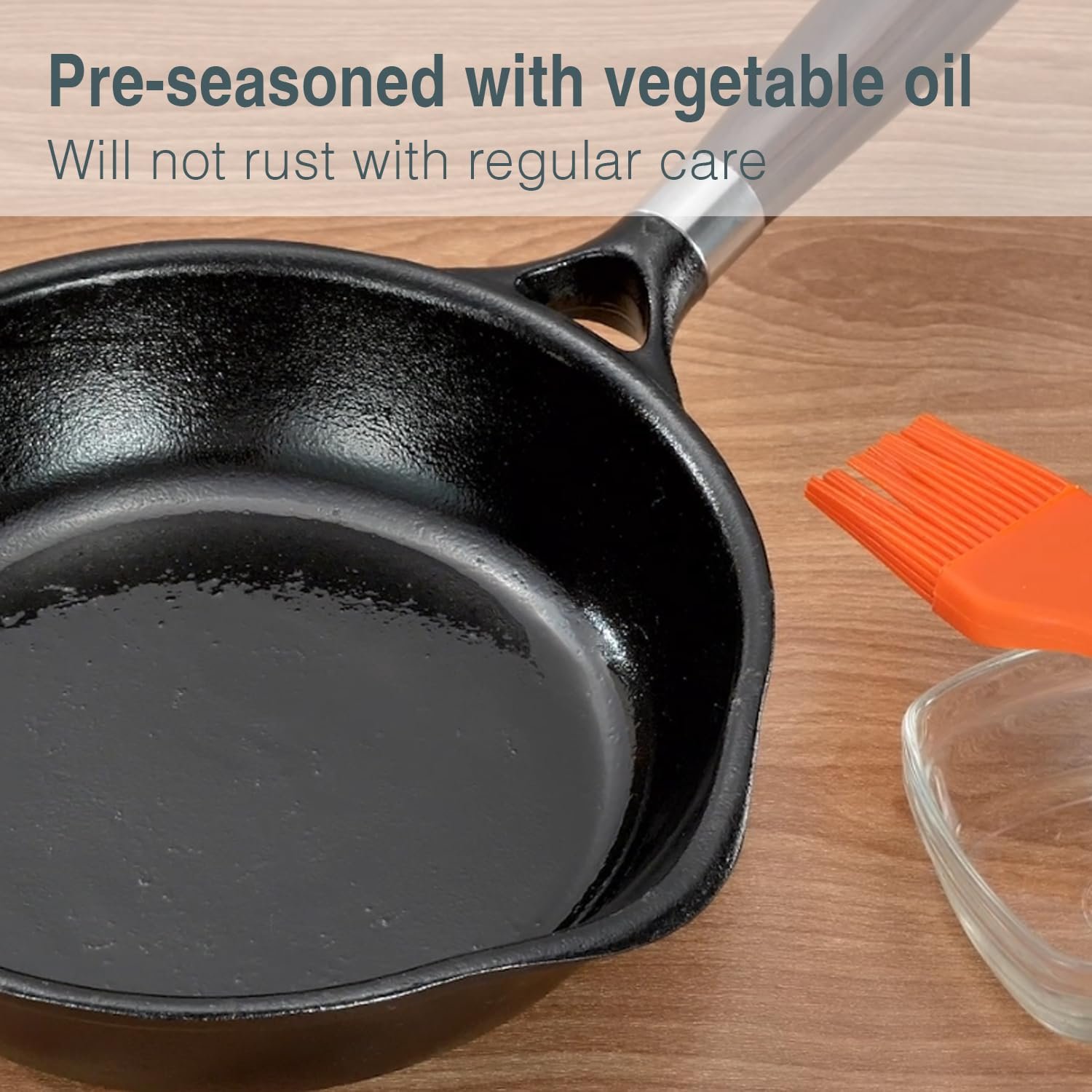 • Pre-seasoned with vegetable oil – Will not rust with regular care