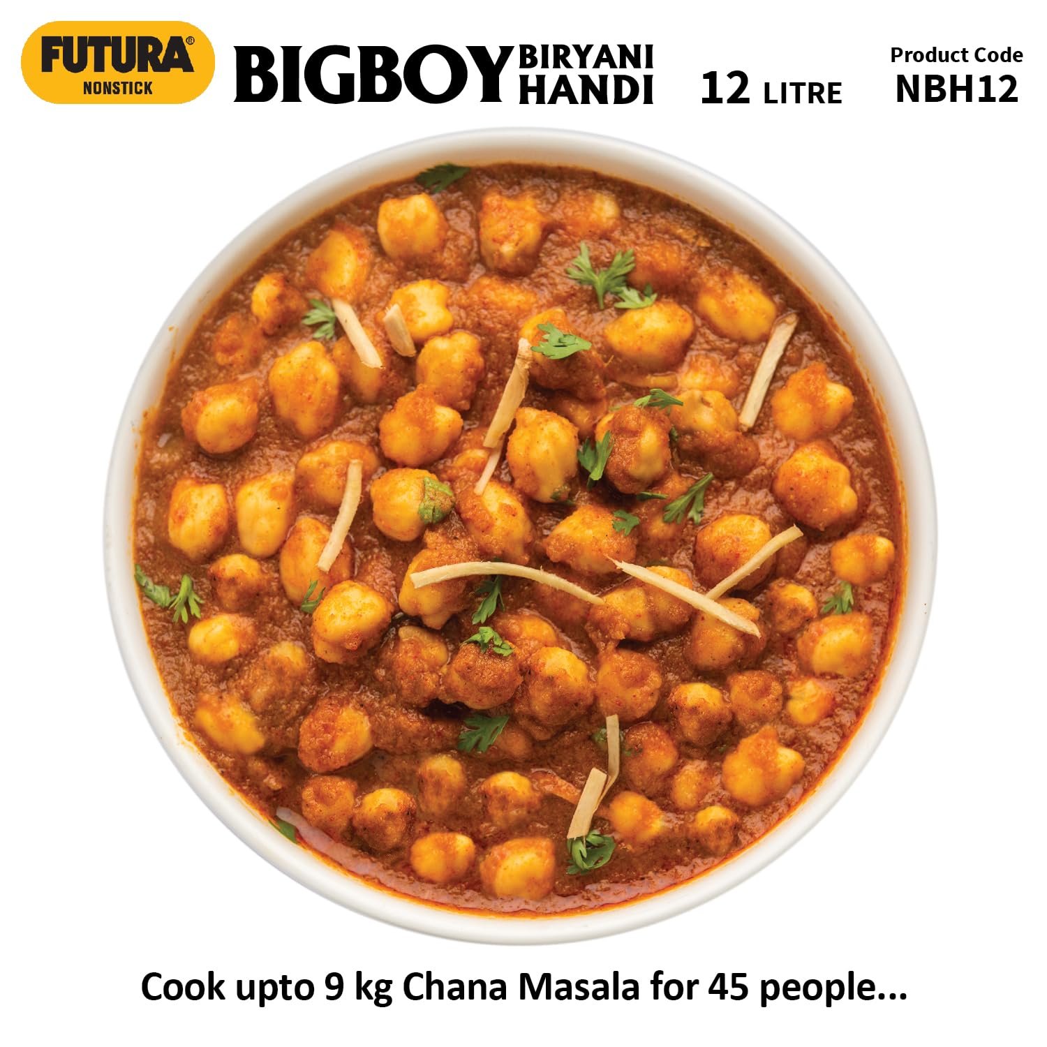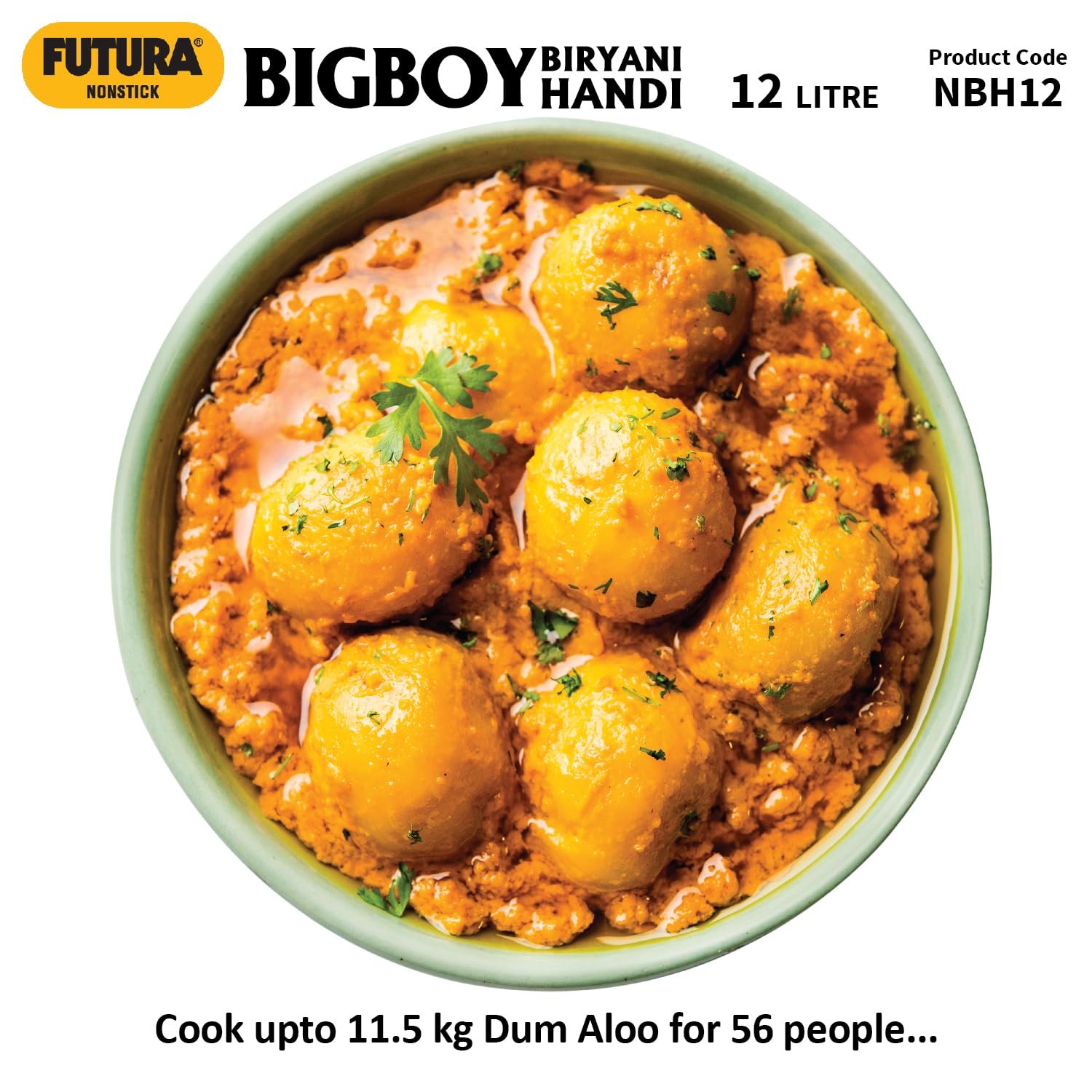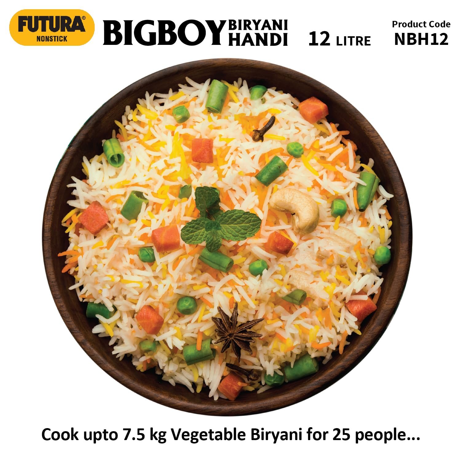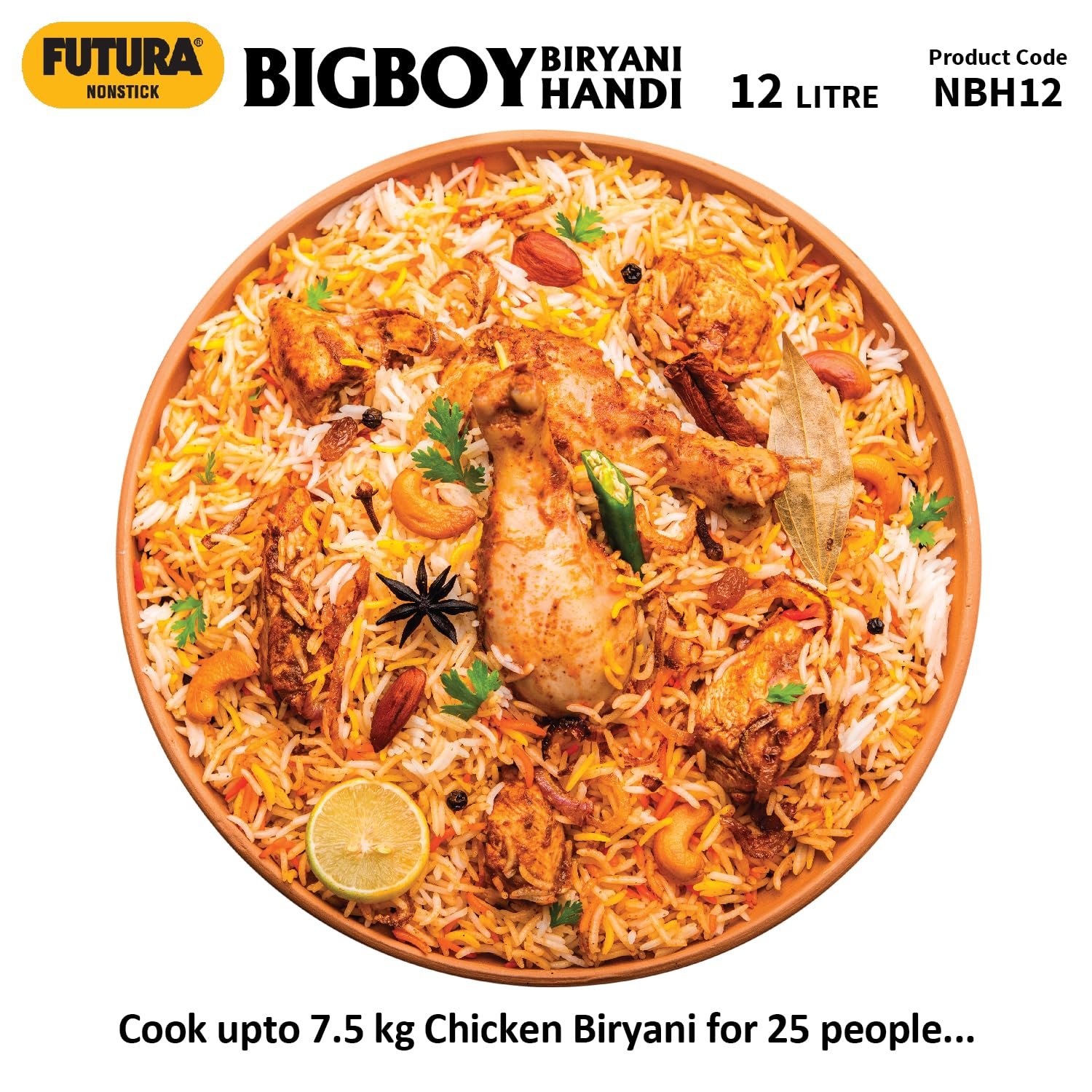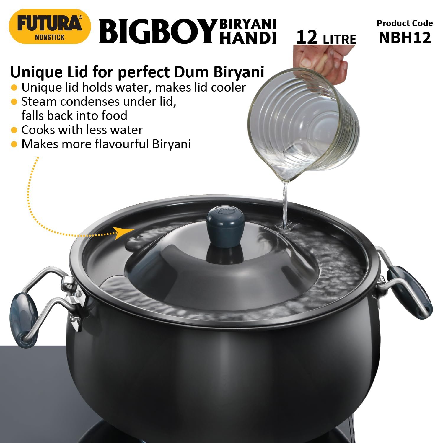 • Unique Lid for Dum Biryani – holds water, makes lid cooler. Steam condenses under lid, falls back into food. Cooks with less water. Makes more flavourful Biryani