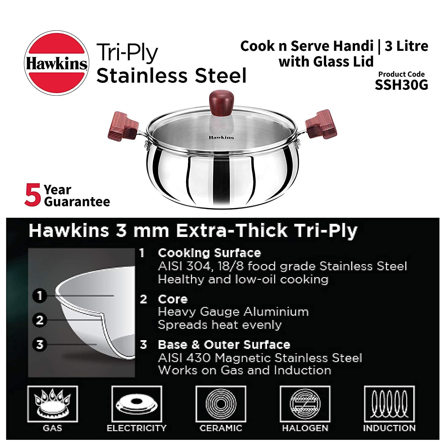 • Stainless Steel Base and Sides – AISI 430 magnetic Stainless Steel. Works on Gas + Induction