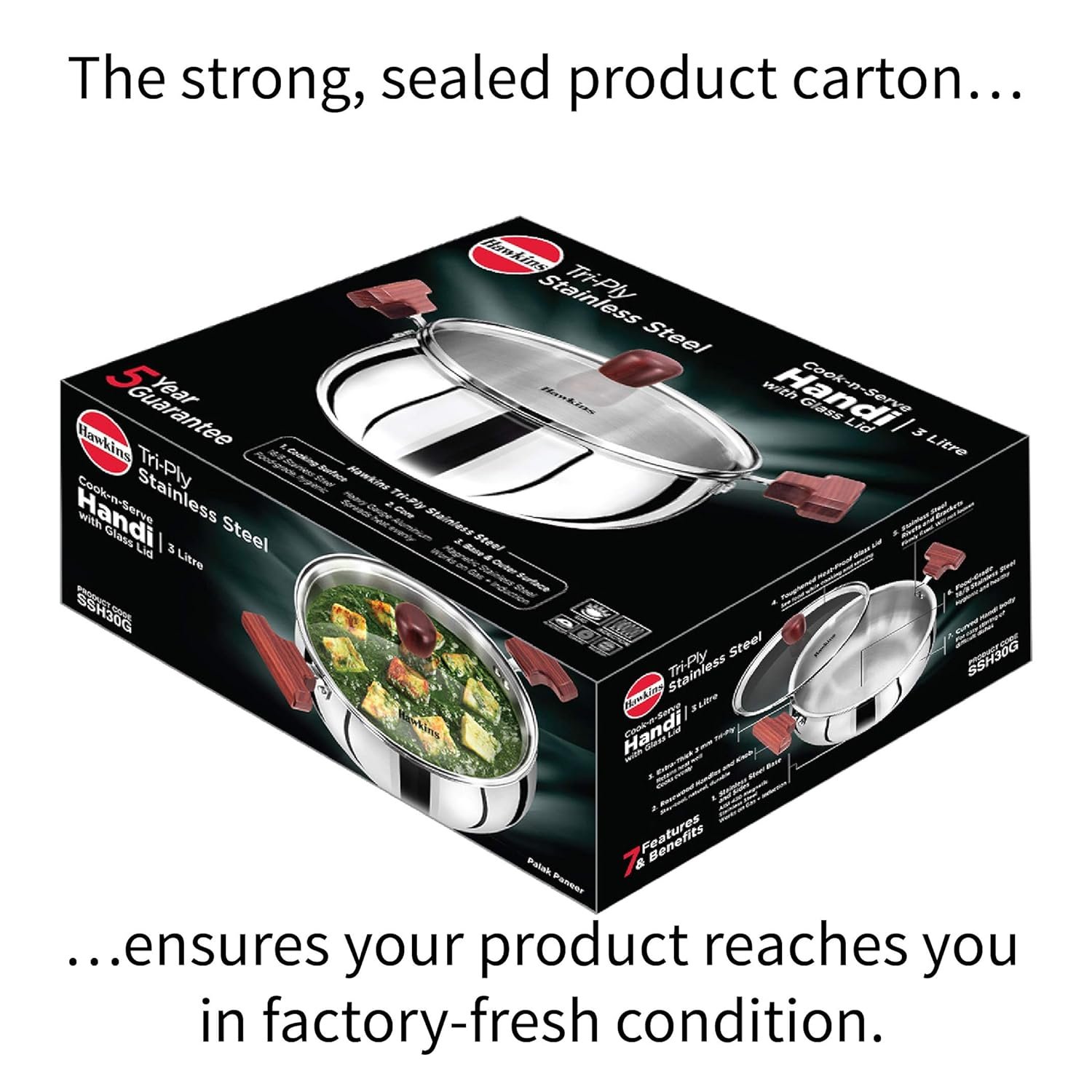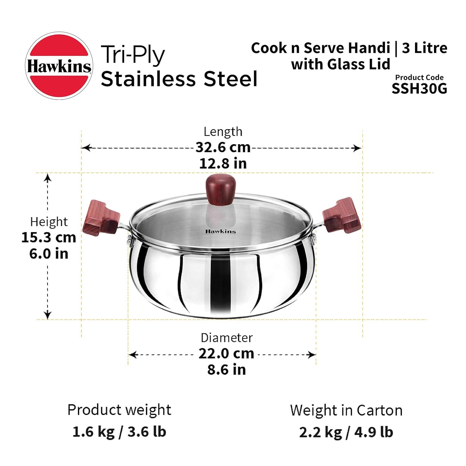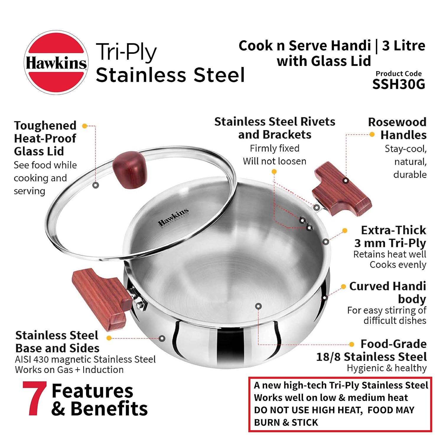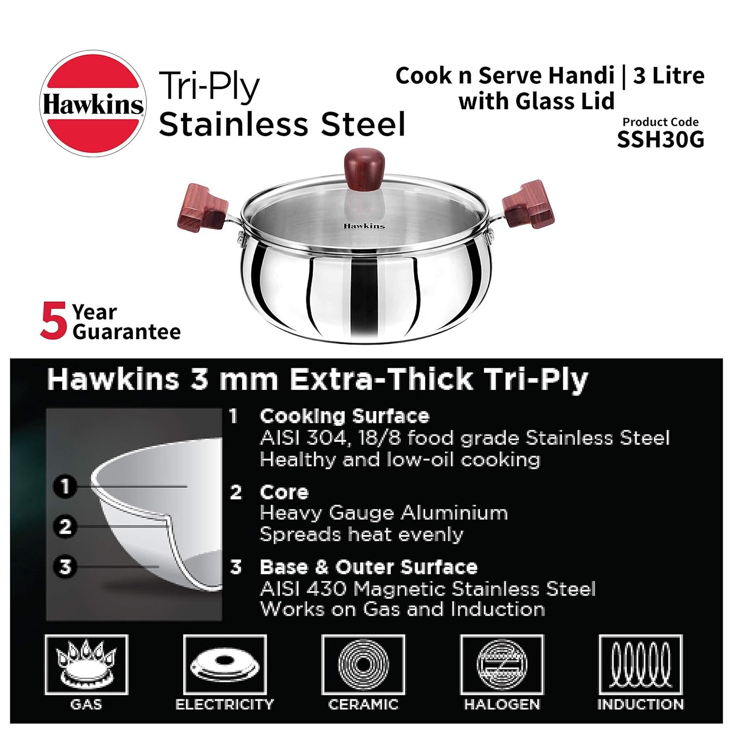 • Hawkins Tri-Ply Stainless Steel Cookware is made of three layers