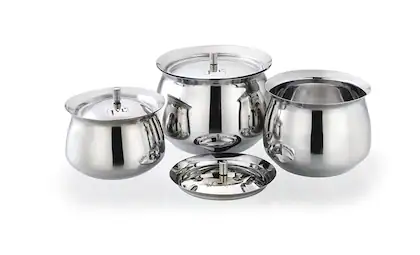 Jvl serving handi easy to clean and wash, they have very exotic silver shining. Highly durable and made of fine quality stainless steel. Uses- used for preparing tea, coffee, boiling milk cooking more such liquid and all type of product. Used for cooking more food compare to frying pan due to its deep vessel height. This handi set cook and serve ware is stylish and beautiful to look at. It is durable and made of high quality stainless steel material. The handi set which can be used for storing , cooking, mixing or serving food items. This set is made from high quality stainless steel making it exclusive and durable.This handi set has been beautifully designed to add grace to your dining experience. It is strong in construction and will not bend or have dents during normal use. Stainless steel is hygienic to use and easy to clean as compared to other materials.