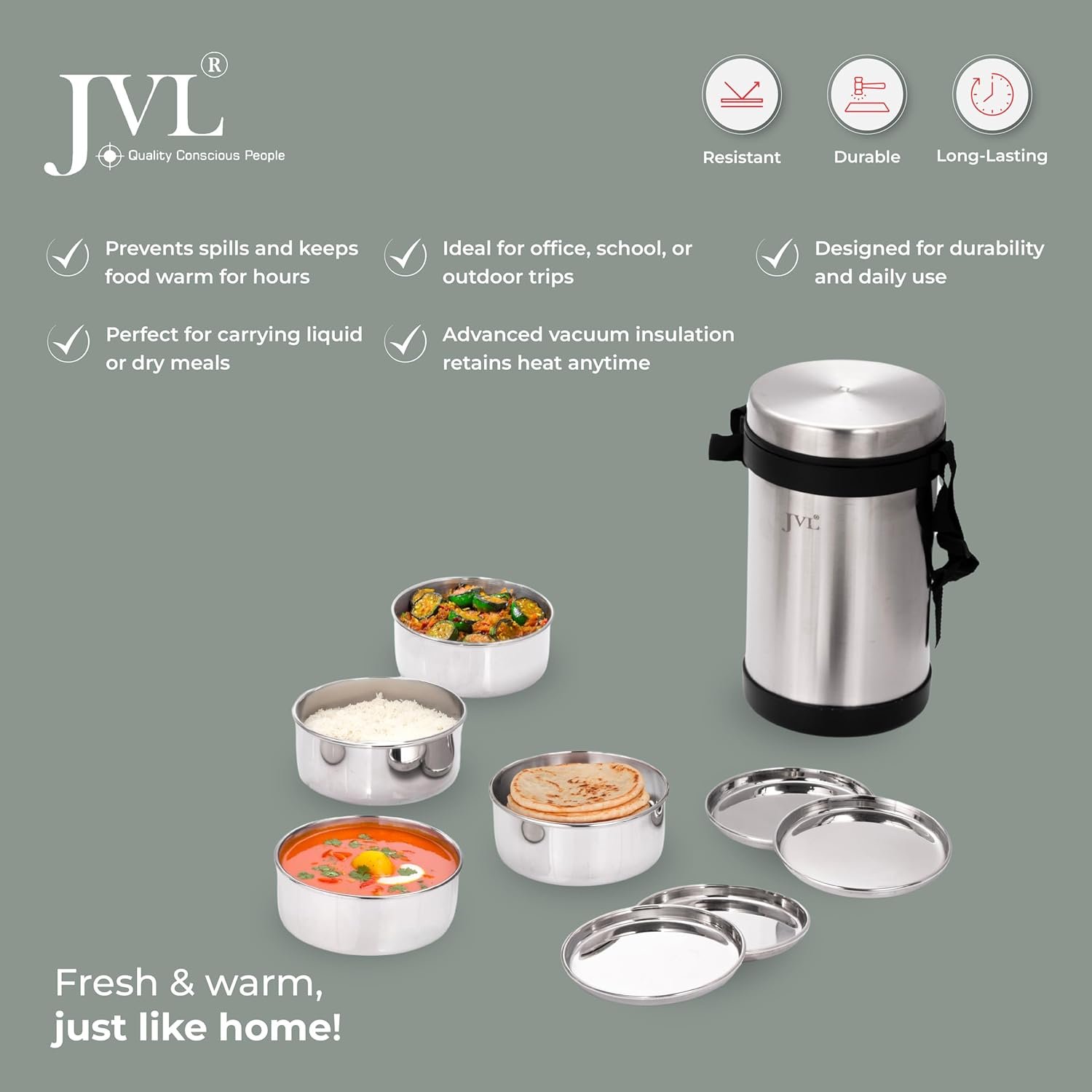 Leak-Proof & Vacuum-Insulated Design: Designed to prevent spills, the leak-proof, vacuum-insulated tiffin set keeps meals warm for extended periods, ensuring fresh and flavorful food anytime, anywhere.