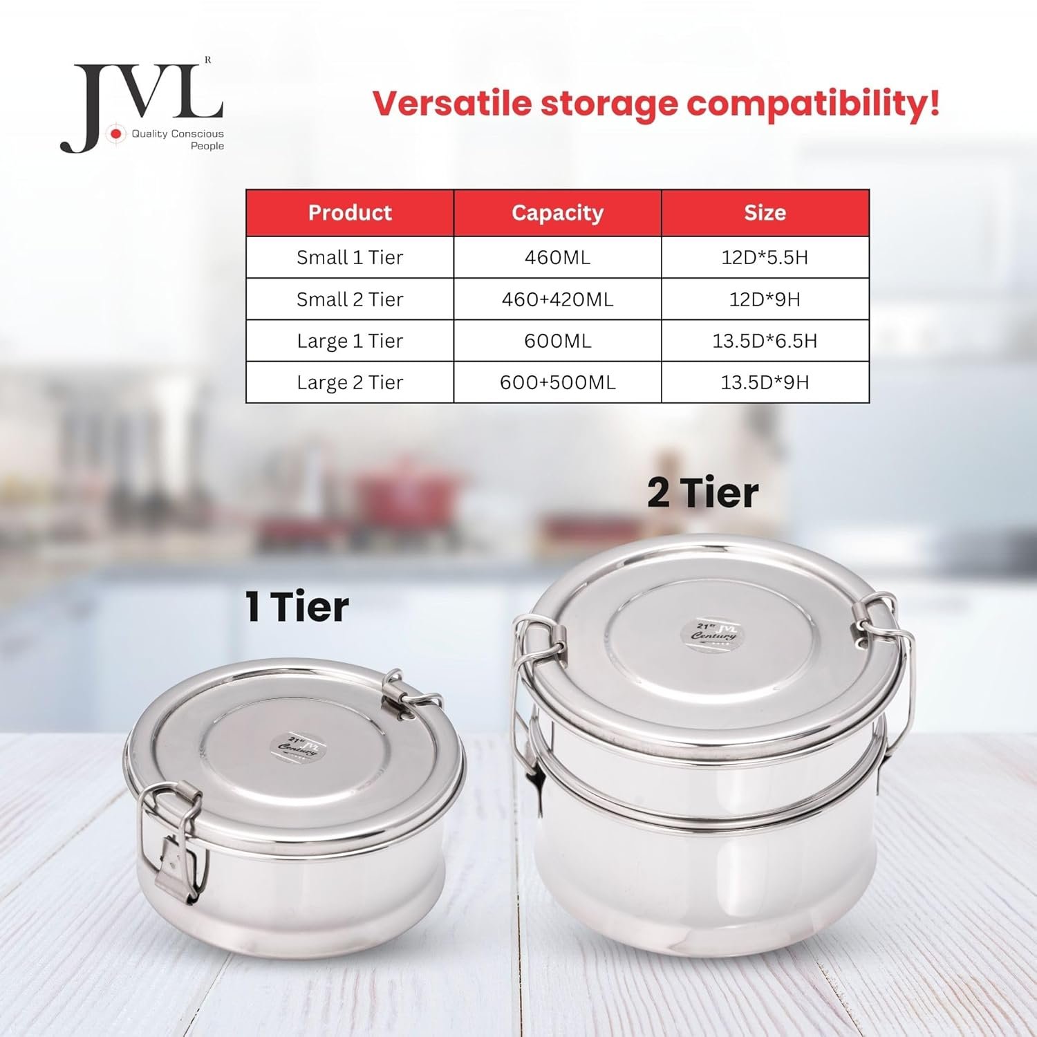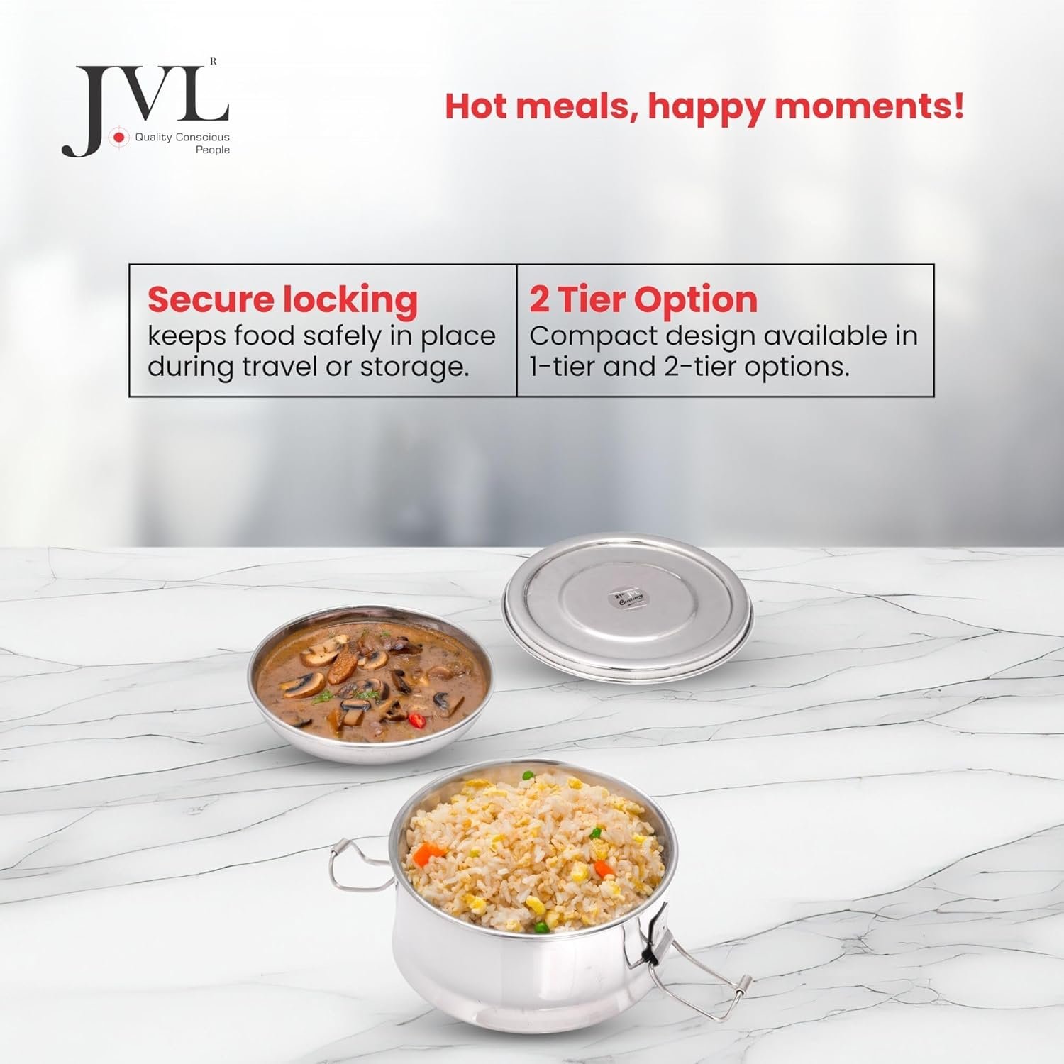 Our smart single compartment design means you can pack ur favourite snacks, sliced fruits, veggies, chips comfortably. The product is designed for not only dried food items but also for liquid based items as it is leak-proof. Healthy, safe, and eco-friendlyplastic containers make for poor health choice. They may leak chemical toxins in your food and typically do not last very long. With our 100 stainless steel container youd be making a healthy and safe choice, with the added benefit of getting years of usage. Jvl tiffin box products provide a great way to lead a healthy, safe, and eco-friendly lifestyle.Perfect for all age groupsthe lunchbox is designed to be friendly for all age groups. It has a easy to open locking mechanism to ensure that it does not open accidentally inside your bag. The plate on each of the container has a special silicone coating which makes the tiffin box leakproof. Why choose jvl tiffinwith jvl tiffin youd be buying a premium quality product at affordable prices. Our brand is built on delighting customers through innovative designs and quality durable construction. We rely on decades of research and in-market feedback in international markets for our products. And we are committing to back this up with a 100 satisfaction guarantee. If you dont love our product, return it for a full refund, no questions asked.