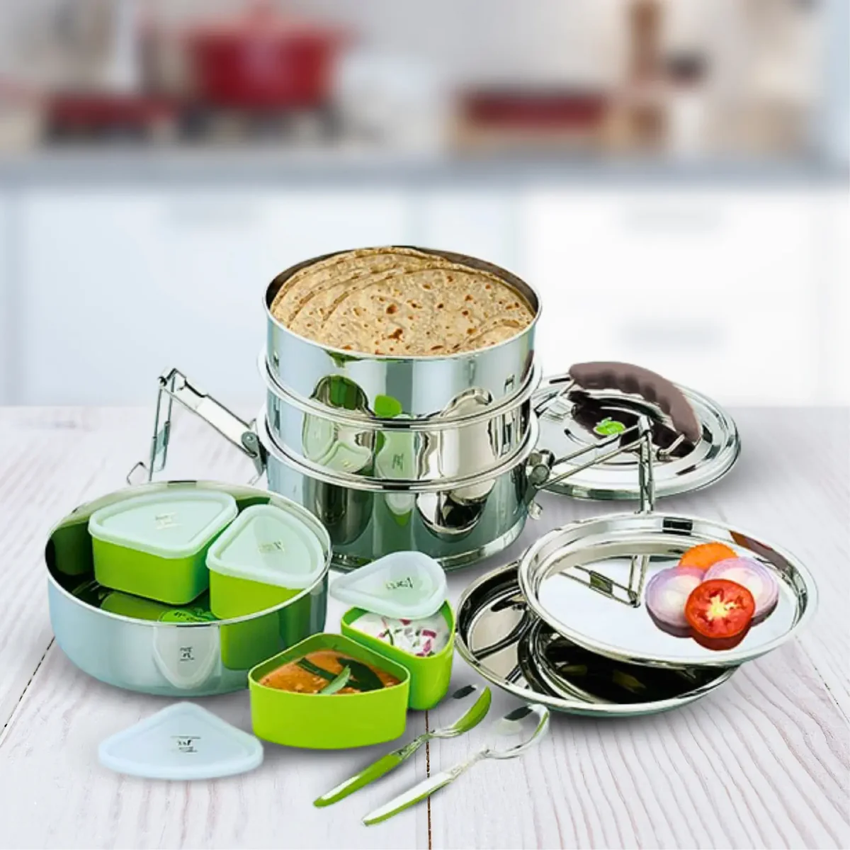 Square-shaped 4-tier tiffin featuring four small plastic boxes for versatile meal organization