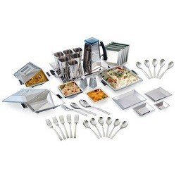 Package Contents: 1-Piece Serving Tray, 4-Pieces Full Trays, 4-Pieces Half Tray, 4-Pieces Salad Tray, 2-Pieces Small Dish with Steel Lid, 2-Pieces Medium Dish With Steel Lid, 1-Piece Fruit Bowl, 8-Pieces Vegetable Bowl, 4-Pieces Soup Bowl, 4-Pieces Square Glasses, 1-Piece Jug With Unbreakable Lid, 4-Pieces Serving Spoon, 4-Pieces Table Spoon, 4-Pieces Fork Spoons, 2-Pieces Salt and Pepper, 1-Piece Rice Server (Surface Mirror Finish)