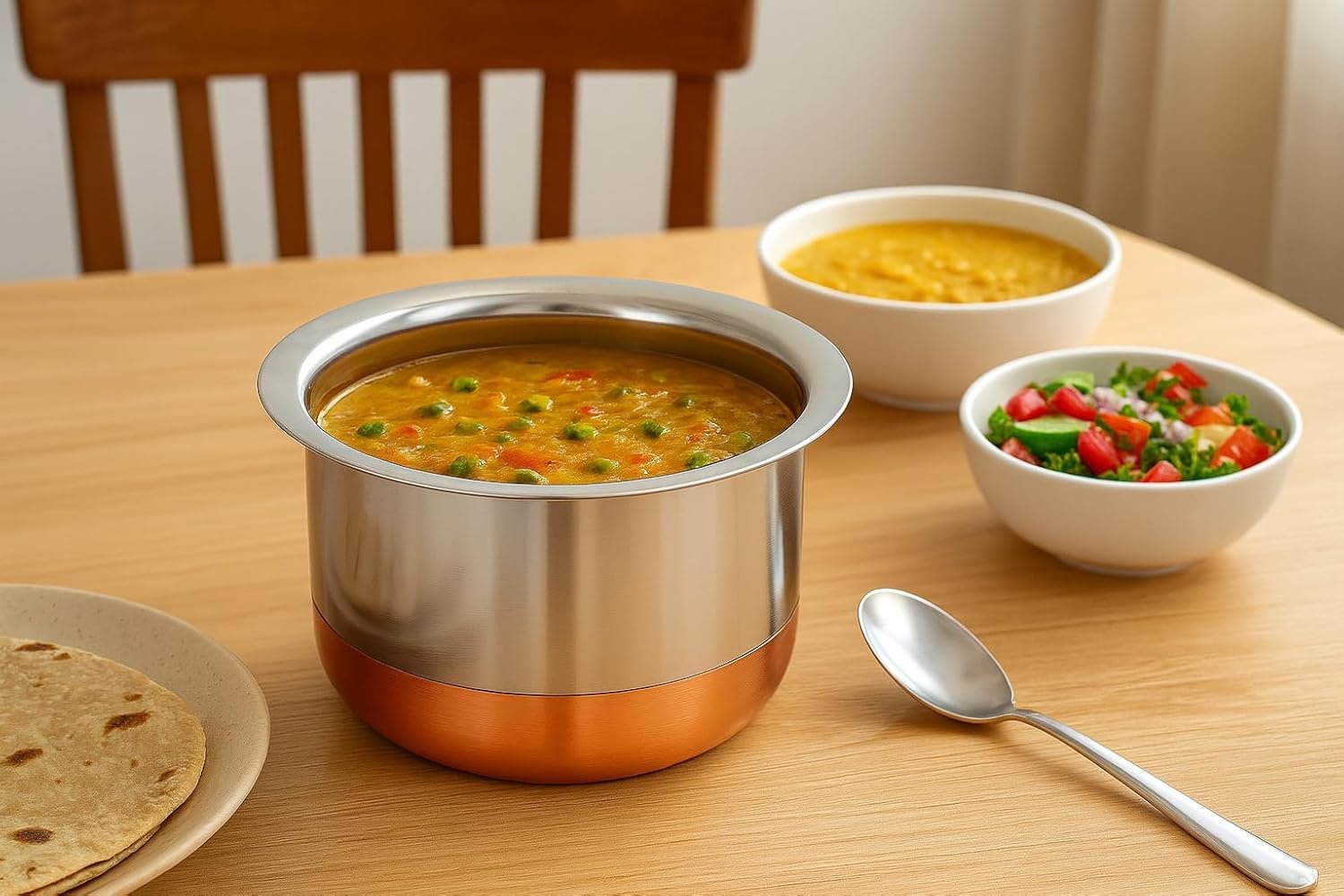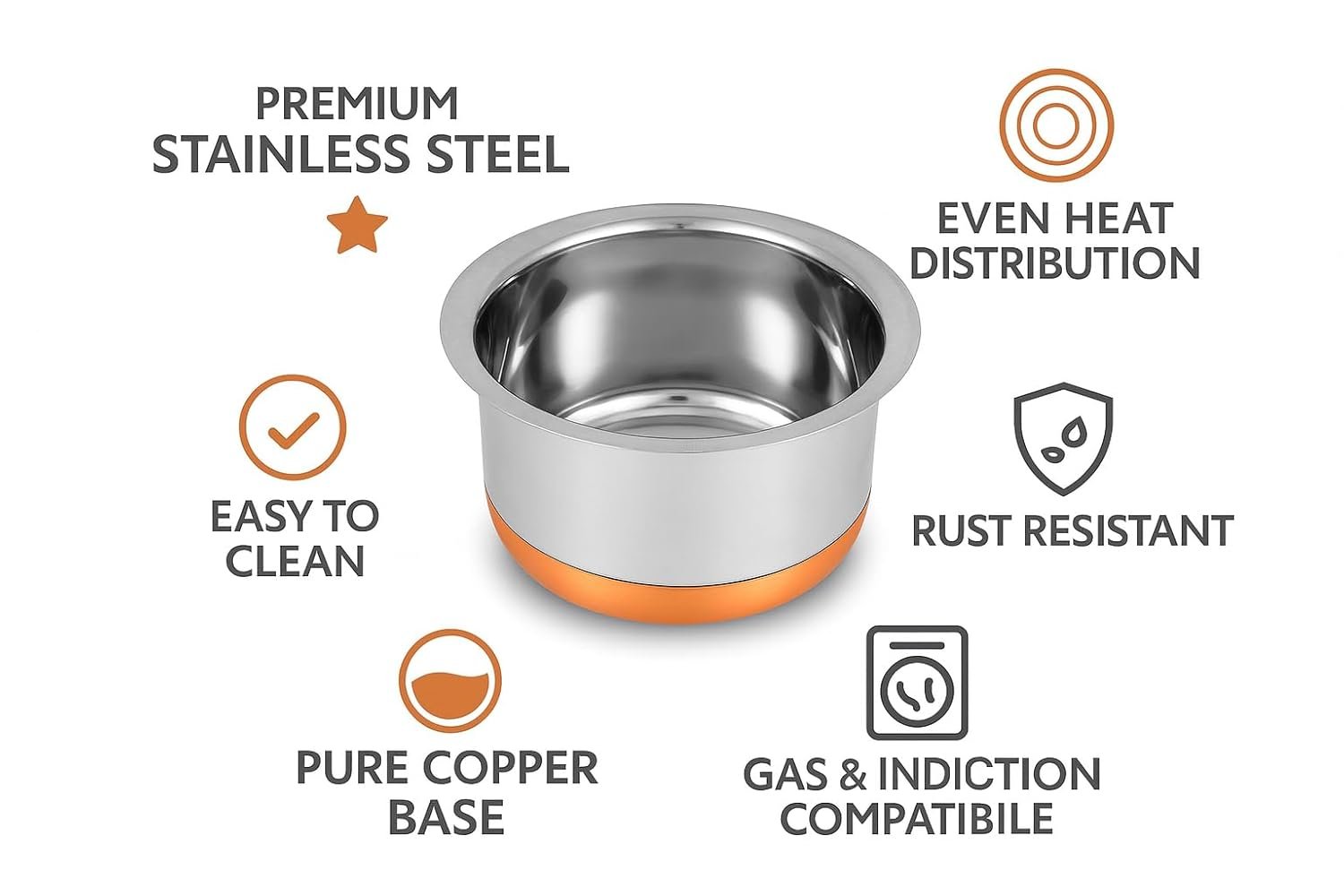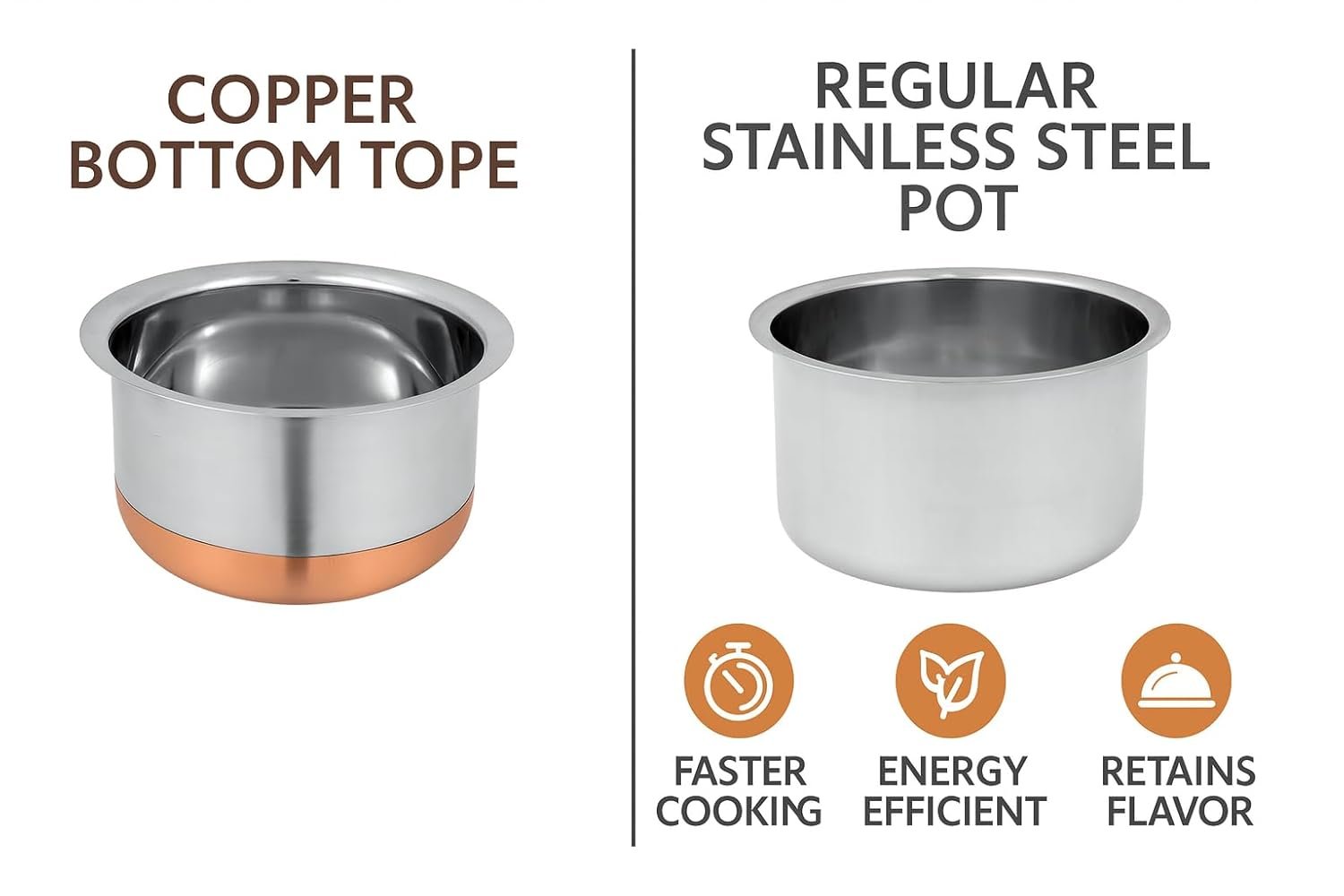 • The Kesariya Stainless Steel Copper Bottom Tope (Flat Base) is a durable and traditional-style cooking vessel designed for everyday kitchen use. Made from high-quality stainless steel with a copper bottom, it ensures faster and even heat distribution while cooking.