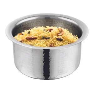 • Its stylish hammered finish design adds a traditional and premium look, while the round base (RB) provides stability and even heat distribution during cooking.