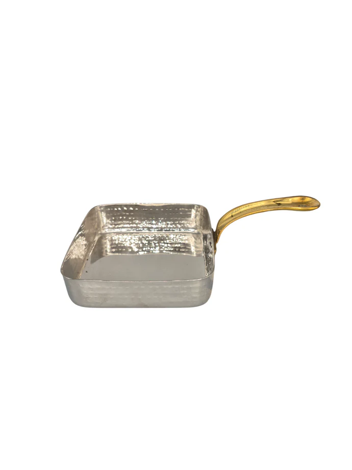 This handmade Hammered Stainless Steel Square Shape Serving Fry Pan with Brass Handle is a versatile and elegant addition to any kitchen. Its solid brass handle and premium quality stainless steel interior make it perfect for cooking and serving food dishes.