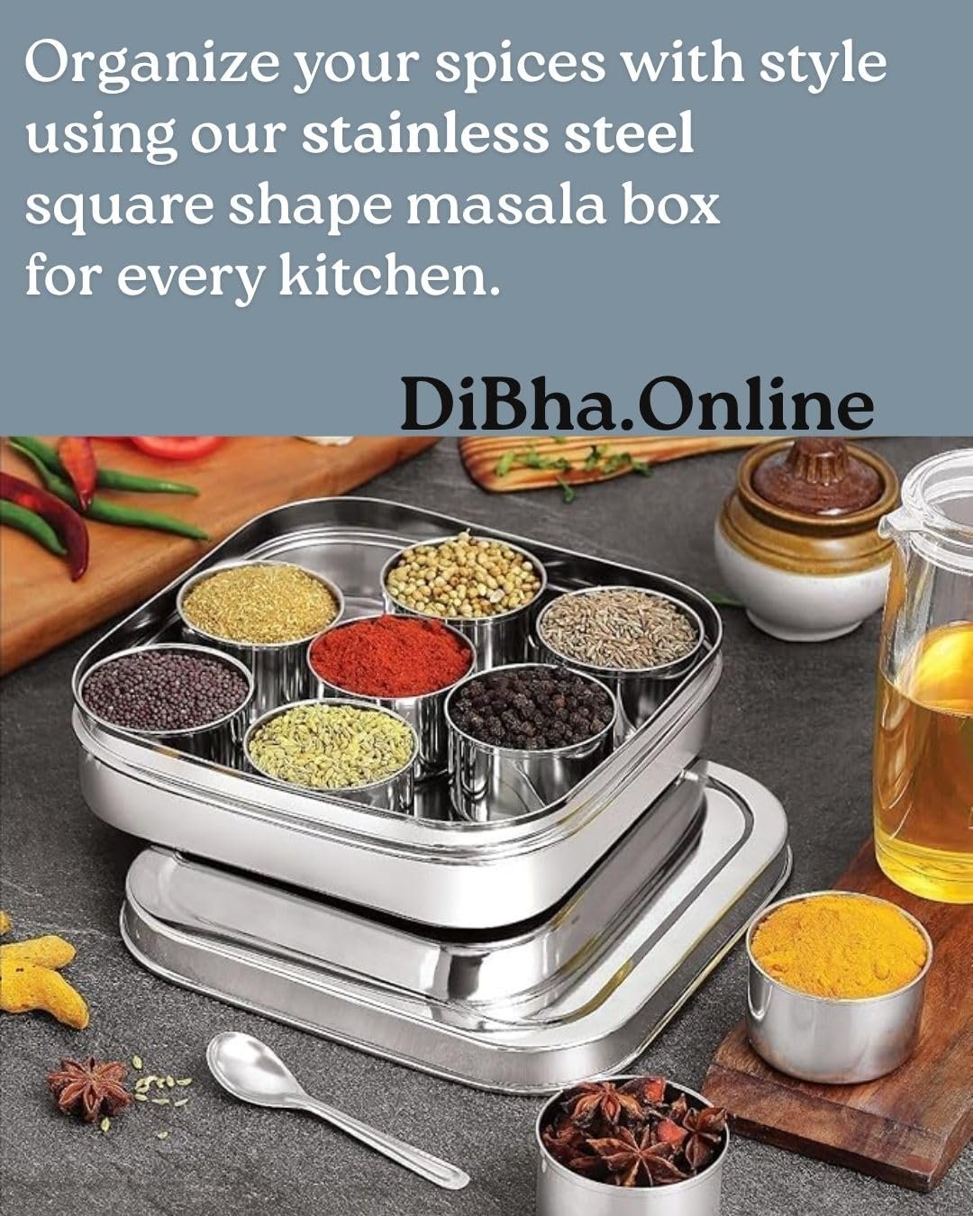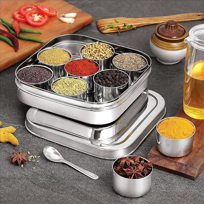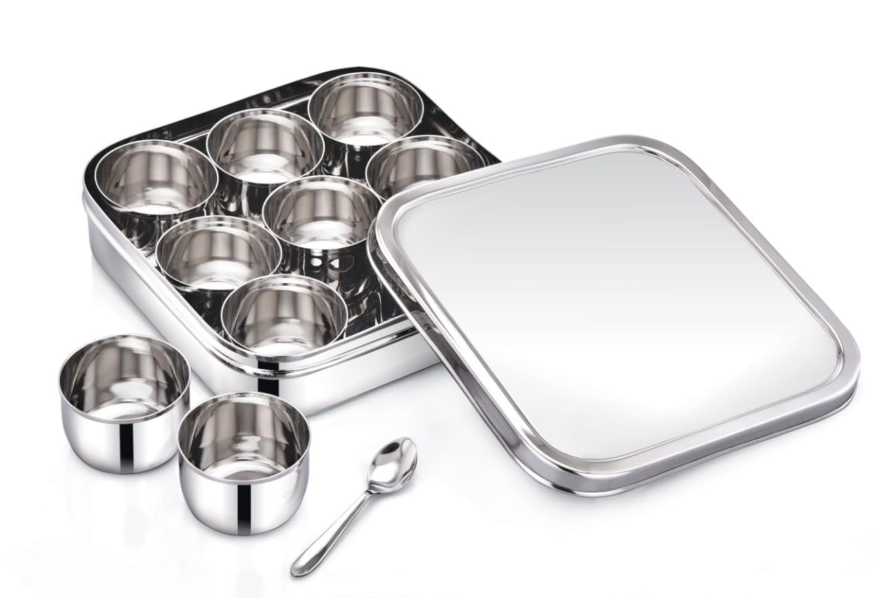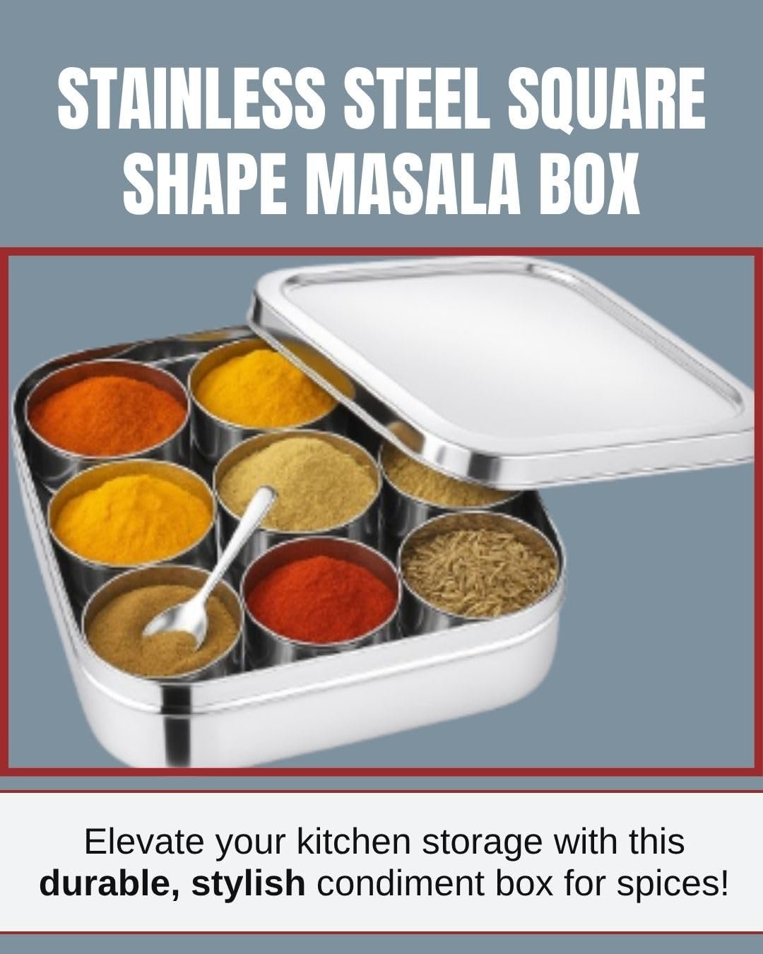 • The most convenient way to store your spices is by bringing home a spice box, as this stainless steel spice box has 9 containers.