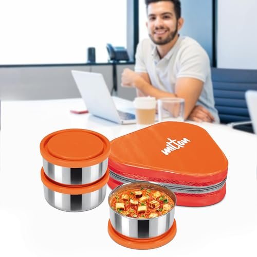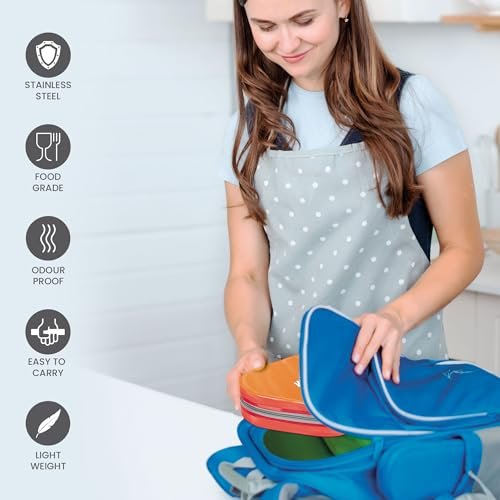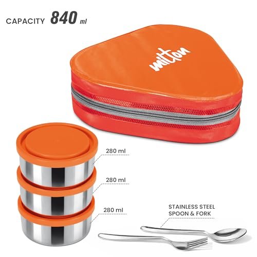 Color: Green; Material: Stainless Steel; Package Content: 1 – Piece Triyum Tiffin (3 Containers, 280 ml Each) This tiffins are made from stainless steel, which is durable, rust-resistant, and easy to clean. This is also a safe and non-toxic material for storing food. They can withstand regular use and are less prone to breakage. Containers are leak proof which prevents any leakage or spillage during transportation. This helps in keeping the food fresh, prevents mixing of flavors, and allows for better organization. Insulated Jacket keep the food warm or cold for a longer duration. This jacket is easy to maintain and clean.This tiffin is lightweight and portable, making it convenient for carrying to work, school, picnics, or other outings. It comes with tumbler which is 100% Leak Proof with the snap-on lid, making it convenient and hassle-free to carry without any fear of spillage. It has a wide mouth and base which makes it easy to clean.