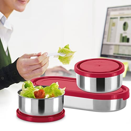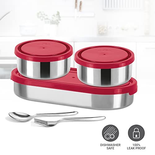MILTON Master Stainless Steel Lunch Box (Oval Container, 450ml; 2 Leak Proof Round Container, 280 ml; Spoon & Fork) with Insulated Jacket, Red | Tiffin | Food Grade | Easy to Carry | Odour Proo