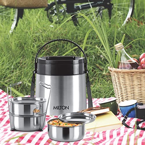 Color: Silver; Material: Stainless Steel; Package Content: 1 – Piece Steel Classic Tiffin (3 Containers, 300 ml Each); Dimension in cms (L x W x H): 15.3 x 15.3 x 18.8 Designed to carry your lunch in style Insulated stainless steel lunch box keeps food hot for long hours. PU insulated Tiffin comes with belt and integrated handle for easy carrying. Elegant design to carry your lunch in style in Insulated stainless-steel container with lifter. It is Easy to store, clean and maintain, it has belt for easy carrying, durable and virtually unbreakable construction. Carry your lunch to work or to a family get-together with ease and relish warm and fresh home-cooked food anywhere you go!