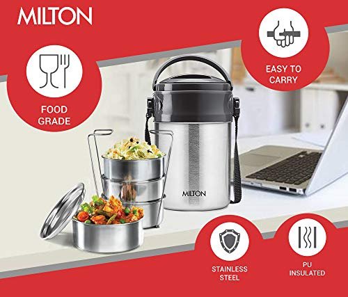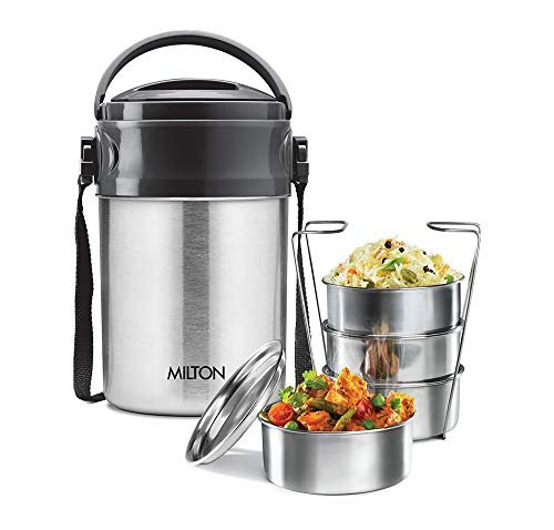 Colour : Silver, Material : Stainless Steel, 4 – Pieces Steel On Tiffin Box (360 ml Each), Product Dimensions in cms (L X W X H): 16.3 X 16.3 X 27.1 Premium Materials: Crafted from durable, rust-resistant stainless steel and BPA-free food-grade plastic, featuring PU insulation to maintain optimal temperatures and keep food hot or cold for extended periods, ensuring longevity and safety. Convenient Strap: Comes with a sturdy carrying strap for easy transport, allowing you to carry your meals comfortably and securely. Carrying Handle: The ergonomic handle is designed for optimal comfort and ease of transport, making it perfect for your on-the-go lifestyle. Its sturdy construction ensures a secure grip, allowing you to carry the lunch box effortlessly, whether you’re heading to work, school, or a picnic. Versatile Usage: Perfect for picnics, daily lunches, and travel, this tiffin allows you to transport a variety of foods without worrying about leaks or odours. Whether you’re packing healthy meals for work, enjoying outdoor activities, or taking home-cooked dishes on road trips, it keeps your food fresh and at the right temperature.